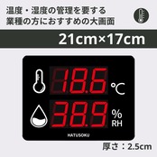 【大画面で業務用におすすめ】170㎜×210㎜の大画面、鮮明なLED表示のデジタル温湿度計です。遠距離からもはっきりと温度・湿度が確認できるので、体育館、酒類の貯蔵庫、ホットヨガ、パン工房、温室など、温湿度管理を要する業種の方におすすめです。