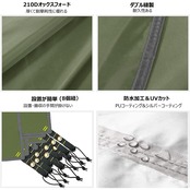 【便利な固定穴】テントシートに固定穴ついてます。ハトメも補強します。ペグで固定可能です。ハトメにショックコードも搭載し、取り付けは簡単です。ポールとガイロープあれば簡易タープとしても使うことが出来ます。