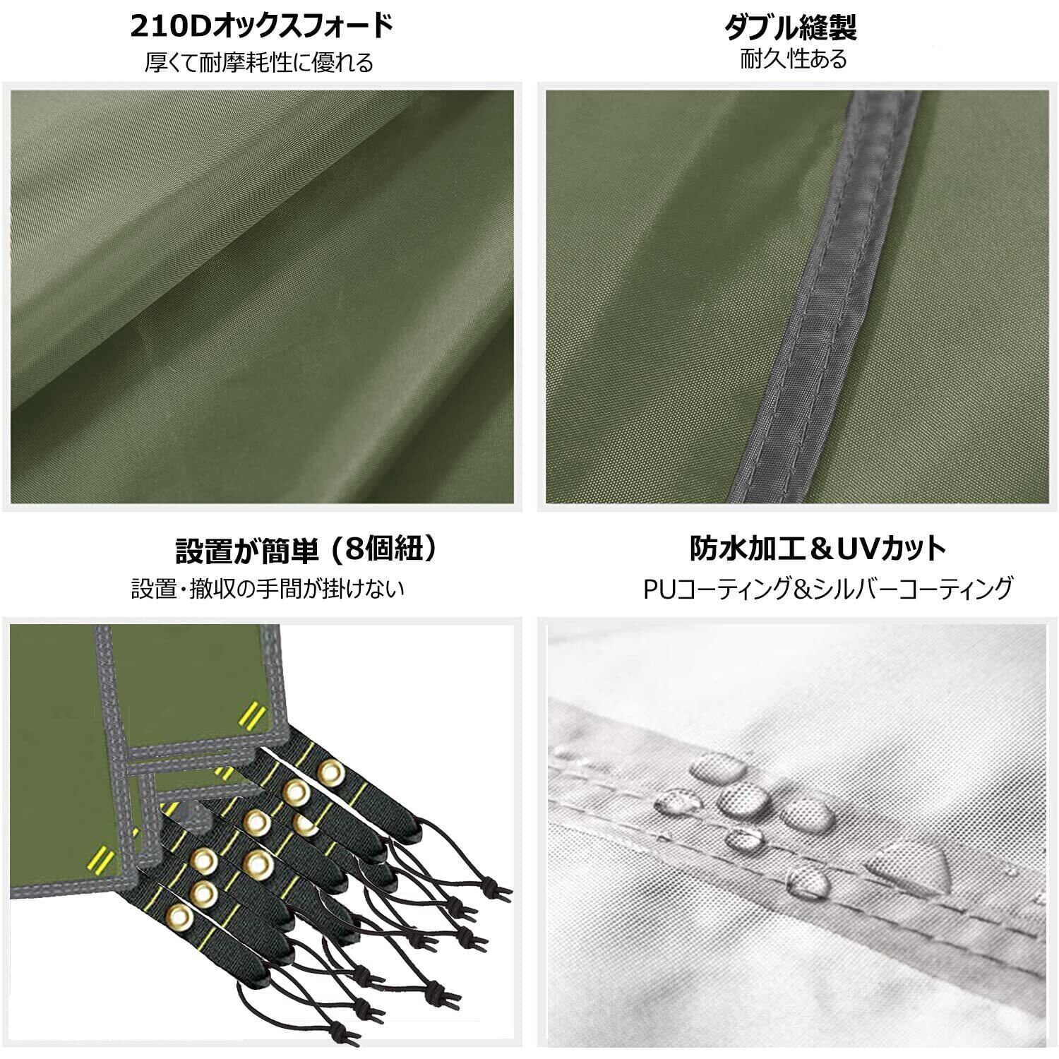 【厚手の210D生地】テントシートは210Dポリエステルオックス素材を採用し、強度不足の心配必要がない、薄い素材のシートより耐久性があります。優れた耐摩耗性があり、長年の使用でも摩耗しにくく、耐久性も優れます。防水性と耐久性を兼ね備えたテントシートです。