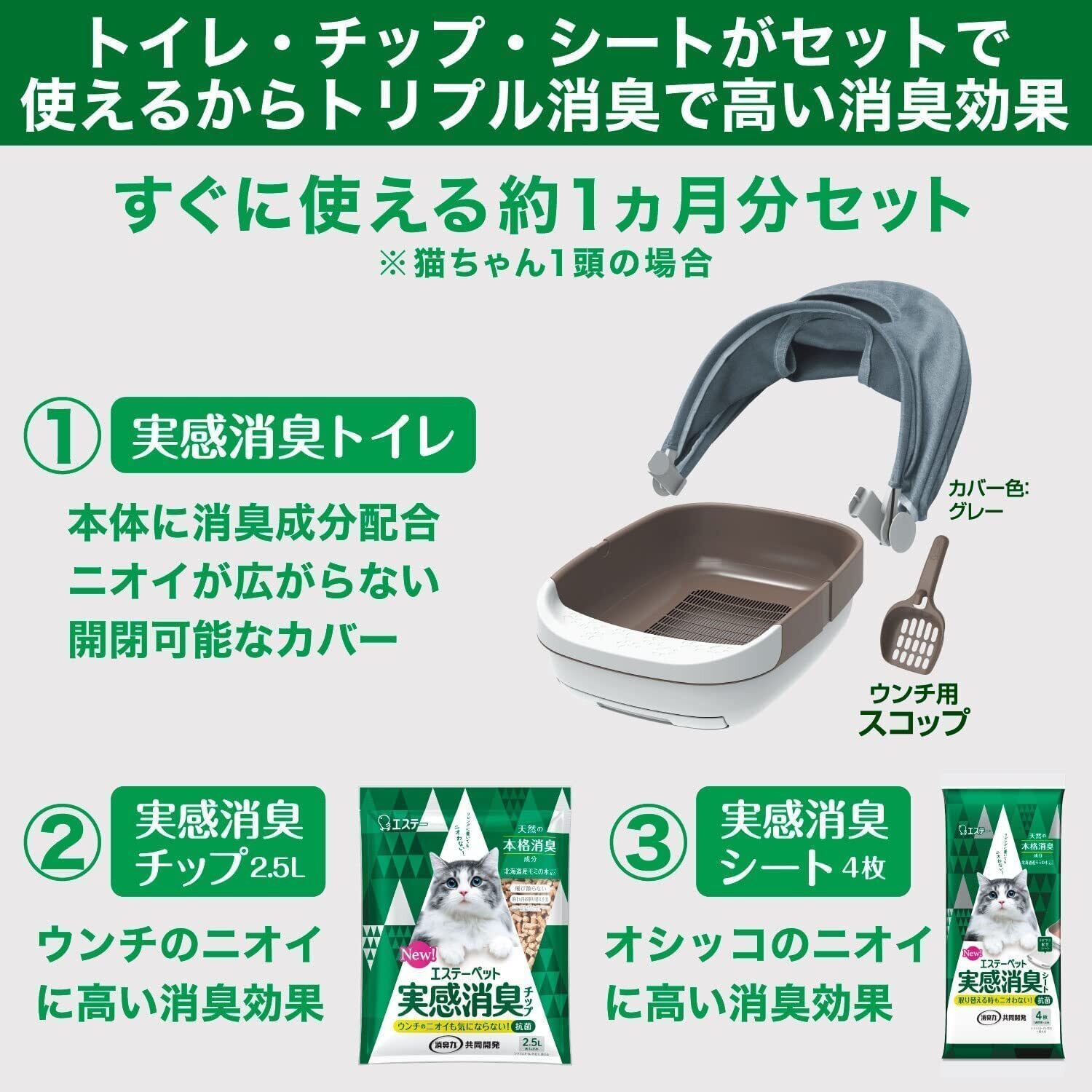 ●トリプル消臭で高い消臭効果。●実感消臭チップトドマツの針葉粉体×機能性ナノパウダー(※1)。北海道産モミの木(トドマツ)の粉体と機能性ナノパウダーがウンチのニオイに高い消臭効果を発揮。●実感消臭トイレトドマツの針葉粉体。ニオイが気になるスノコ部分に北海道産モミの木(トドマツ)の粉体を配合。●実感消臭シートトドマツの針葉粉体×クエン酸。北海道産モミの木(トドマツ)の粉体とクエン酸がオシッコのニオイに高い消臭効果を発揮。●ニオイを広げない。●ルーフカバーを閉じることで、チップの飛び散りとニオイの広がりを抑えます。※開いた状態でもお使いいただけます。●ルーフカバーは汚れやニオイがつきにくい防汚・防臭抗菌加工です。※すべての菌に効果があるわけではありません。●お手入れが簡単。水洗いOK。●ルーフカバーは、フルオープンにできるので、排泄の処理や砂のお掃除が楽にできます。●ルーフカバーは、取り外しが可能で、汚れが気になったときは、簡単に水洗いすることができます。●リビングになじむ。●防汚・防臭抗菌加工のファブリックタイプのルーフカバーは、インテリアになじむスマートなデザインなので、リビング使いにおすすめです。※1ナノレベルの孔(あな)を持つ、悪臭を吸収する消臭剤 ●天然の本格消臭成分、北海道産モミの木(トドマツ)の粉体とクエン酸配合で、オシッコのニオイに高い消臭効果を発揮します。●「実感消臭シート」は1週間分のオシッコをグングン吸収するので、お手入れの手間が減ります。●抗菌仕様のシートです。※すべての菌に効果があるわけではありません。●1週間ニオイの広がりを抑えるので、安心して使えます。●シートの表面が白くオシッコの色がわかりやすいので、健康状態をチェックできます。 使用方法 ●詳しい使用方法は、同梱の冊子をご覧ください。●(1)ルーフカバーはたたまれたまま本体にセットしてください。●(2)シートトレイに「実感消臭シート」を1枚敷いてください。●(3)スノコに「実感消臭チップ」1袋(2.5L)を敷き詰めてください。●(4)ルーフカバーを閉じてください。●ウンチ・汚れたチップは、なるべく早くスコップで取り除いてください。●「実感消臭シート」は1週間を目安に新品のシートに取り換えてください。●「実感消臭チップ」が少なくなったら、チップ補充ラインを目安に補充してください。●衛生面、消臭効果を保つため、「実感消臭チップ」は1ヵ月を目安に全量を新しいものに交換してください。●スノコ、シートトレイはチップ全量を交換する際に洗浄することをお勧めします。●ルーフカバーの汚れが気になる場合は、水をよく絞ったタオル、中性洗剤等でふき取ってください。汚れがひどい場合には水・ぬるま湯で手洗いし、陰干ししてください。●「実感消臭チップ」や「実感消臭シート」は水に溶けないので、トイレに流さないでください。●使用後の「実感消臭チップ」と「実感消臭シート」は地域の規則に従って処分してください。●「実感消臭トイレ」を廃棄する際は、地域の規則に従ってください。●本製品は引き出し付きシステムトイレ用の吸収シートです。単体で犬用トイレシート(ペット用トイレシート)として使用しないでください。※直接猫ちゃんが触れるように使用すると、シートが破れ、中身が飛び出す、足裏が汚れるなどトラブルの原因となります。●「エステーペット 実感消臭チップ」と一緒にご使用いただくと、効果的です。●「エステーペット 実感消臭チップ」以外の商品と組み合わせて使用すると十分に効果が発揮できない場合があります。●シート寸法(43cm×29cm)をご確認の上ご使用ください。※シートは外側がツルツルのフィルム面、内側がザラザラの吸水面になっています。フィルム面を下にしてセットしてください。●(1)トレイを引き出し、フィルム面を下にして敷いてください。●(2)シートがずれないようにゆっくりとトレイを奥まで押し込んでください。●(3)スノコの上にチップを入れてください。※シートを振り広げると、中の吸収体が偏ったり、製品が破れる恐れがありますので、注意してください。※シートを切ると、中身が飛び散りますので、切らずに使用してください。
