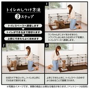 詳細については取扱説明書参照。<組立て・取外しの注意>※床面の材質等によっては、スベリ止めが色移りしたり、キズ・跡等が残る場合がありますので、シート等を敷いて設置することをおすすめします。※ケガや破損の恐れがありますので、2人以上で行ってください。※広い場所を必要としますので、スペースを確保してください。※キズがつかないように床にシート等を敷いて行ってください。<トイレのしつけ方>1専用トイレをサークルの中に置きます。愛犬がニオイをかぎまわり、ソワソワしはじめたら仕切りドアを開け、トイレスペースへ誘導します。2仕切りドアをロックし、トイレが上手にできるまで見守ります。上手にできたときに、トイレスペースの中でよくほめることで習慣づけます。