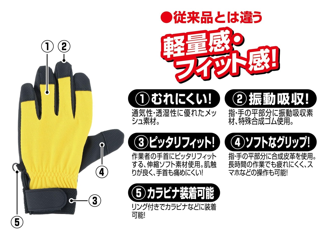 振動吸収:指・手の平部分に振動吸収素材、特殊合成ゴム使用