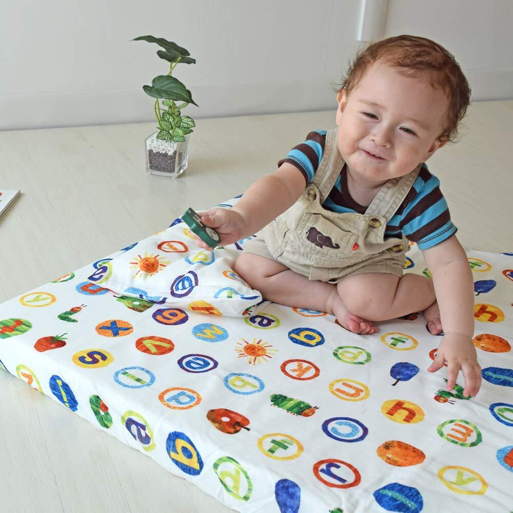 はらぺこあおむしがとっても鮮やかなカラーでプリントされたダブルガーゼ生地を使用したベビーフィットシーツです。素材にダブルガーゼ生地を使用しているのでふんわりと柔らかく、手触りもバツグンです。