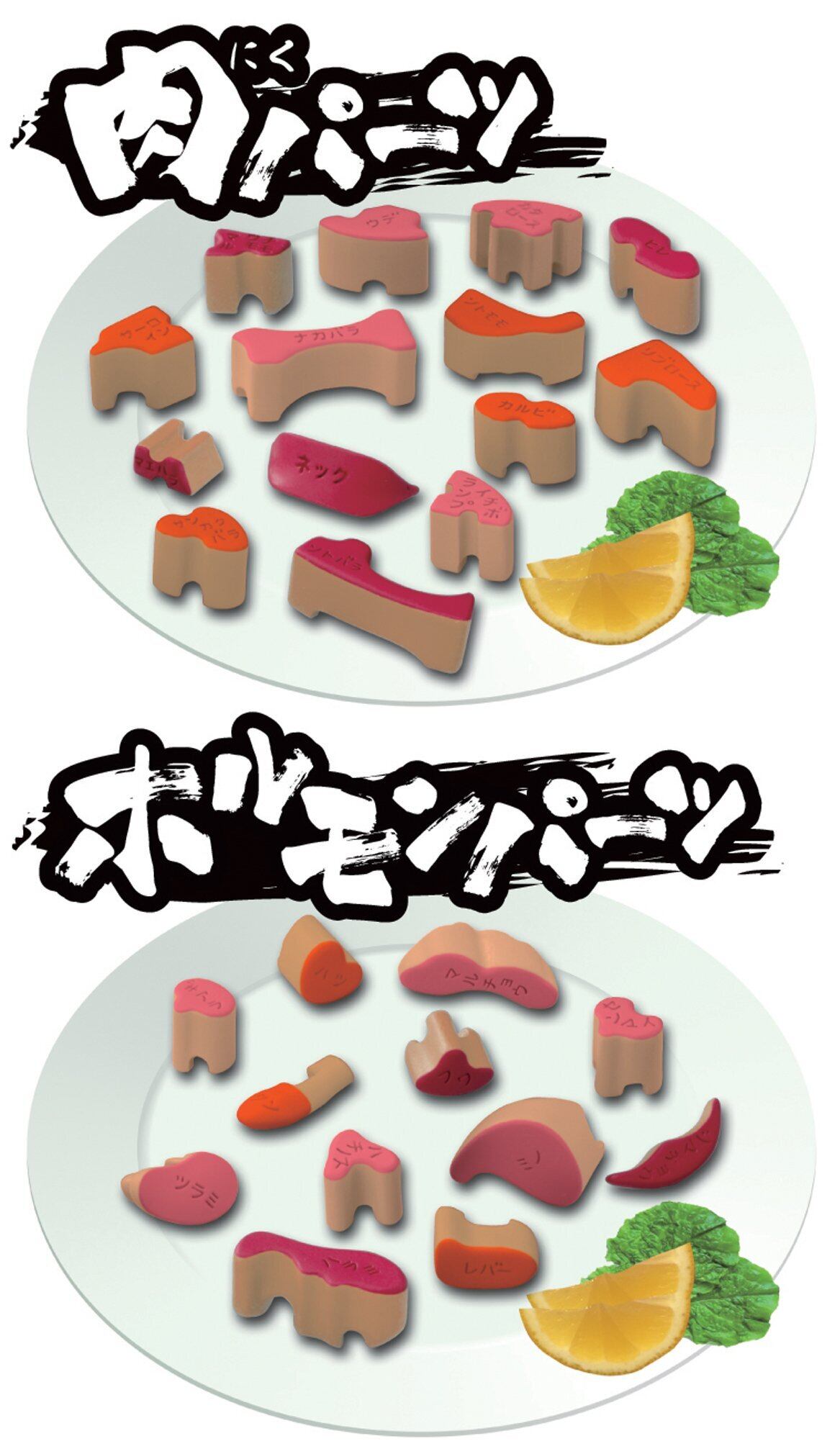 遊びながら肉、ホルモンの部位を学べるパズルが登場!パーツは全37パーツで、2重構造!手の温度で肉パーツの色が変わるカラーチェンジモデル。手で焼肉できちゃう!?付属のお皿型の台座シートに乗せて飾ろう!