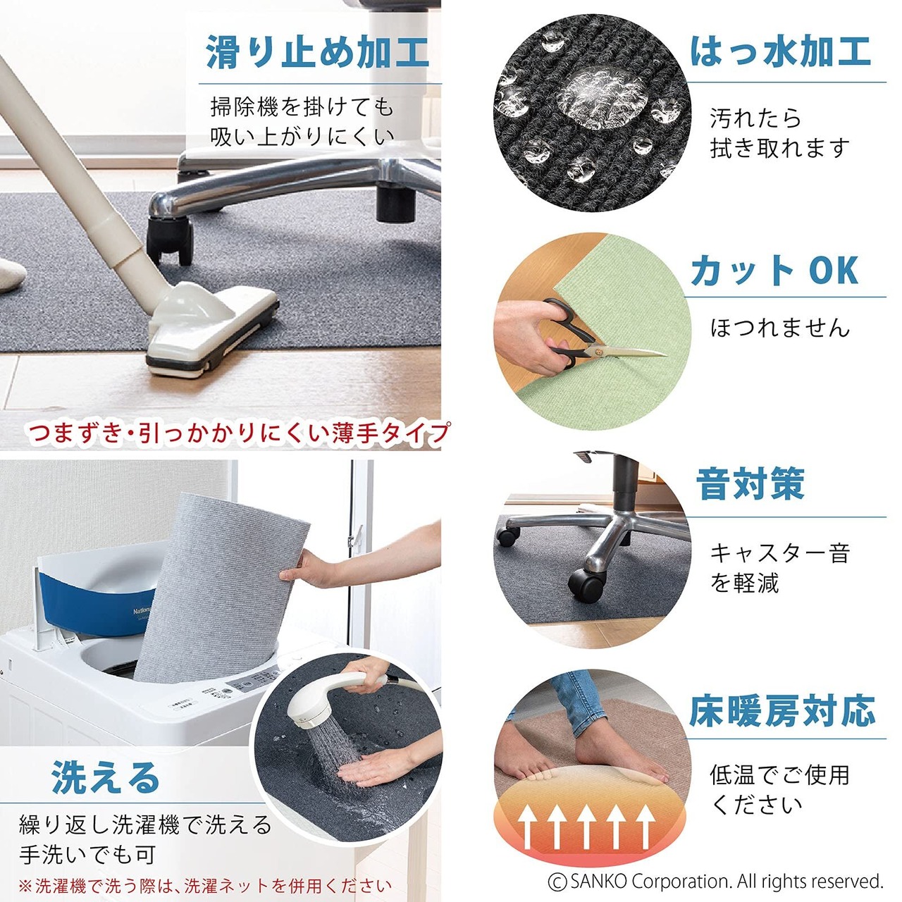 洗濯機OK(繰り返し使えます)、床暖房対応(推奨:低温)、ハサミでカット可能、日本製