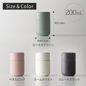 【容量】200mL【サイズ】(バッグ使用時)約φ7.1×11.3cm【重量】約209g【材質】 内びん:ステンレス鋼(セラミック塗装加工) 胴部:ステンレス鋼(セラミック塗装加工・粉体塗装加工) フタ外側:ステンレス鋼(粉体塗装加工) フタ内側:ポリプロピレン パッキン・底クッション/シリコーンゴム【生産国】中国