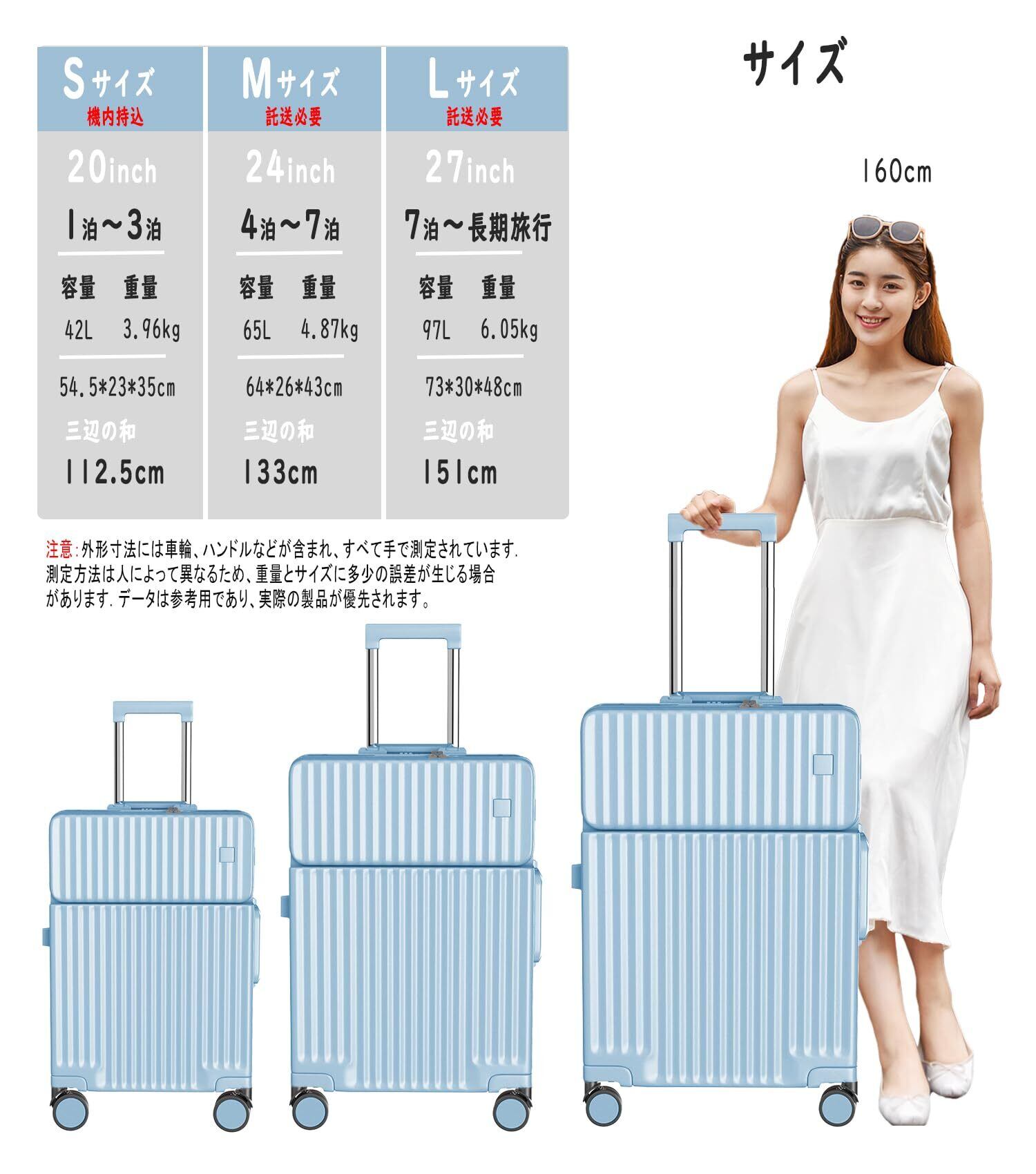 「サイズ」Sサイズの外寸は54.5*35*23cm、重さ:3.96kg 超軽容量、は42リットル、1~3泊に似合います。Sサイズは一部の航空会社だけに適用しますので、事前に航空会社に確認したほうがいいんです。Mサイズの外寸は60*43*26cm、重さ:4.87kg 、容量は65リットル、4~7泊以上。Lサイズの外寸は73*48*30cm、重さ:6.05kg、 容量は97リットル、7泊以上