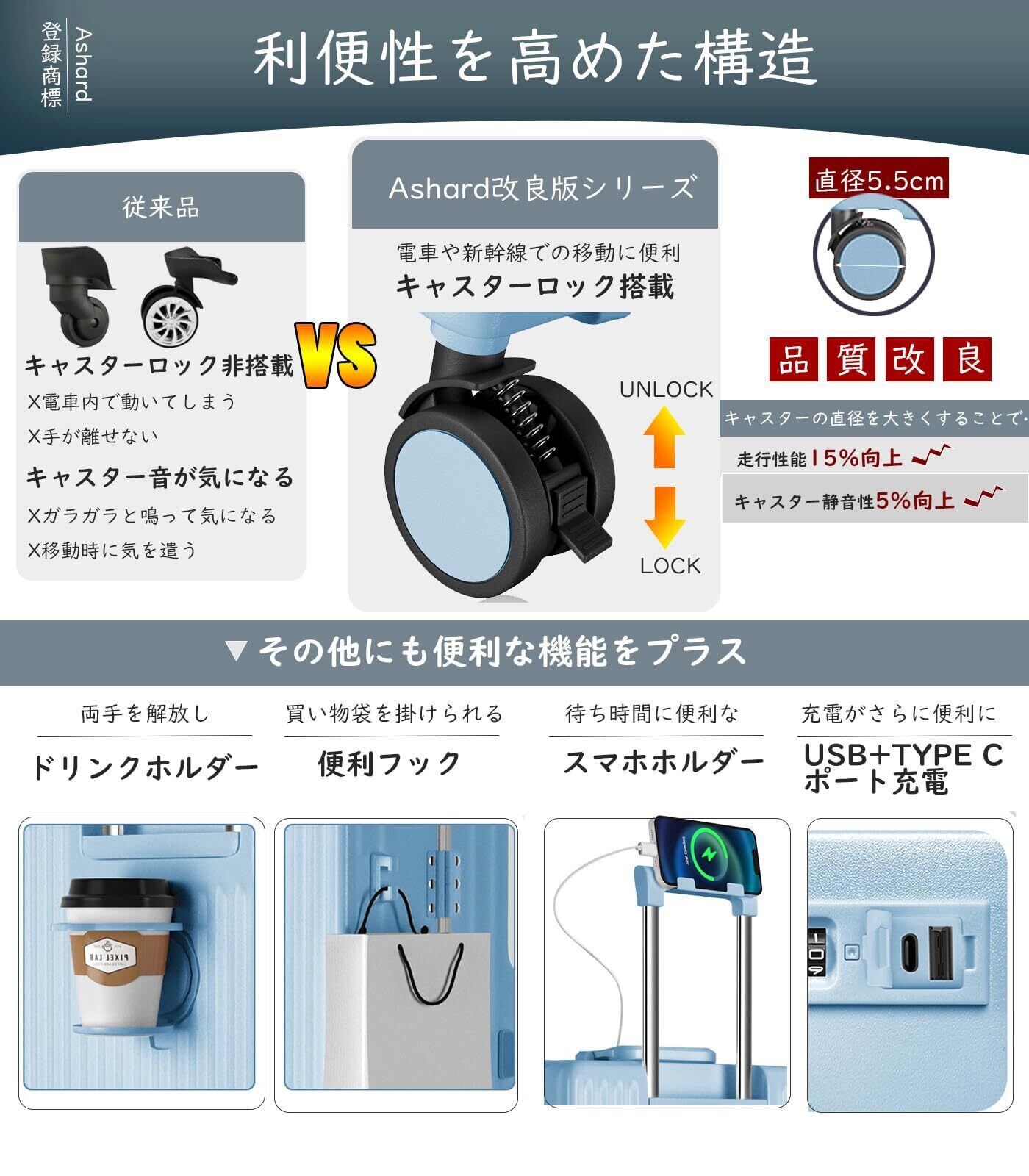【新着商品】[Ashard] スーツケース 多機能フロントオープン キャリーケース ストッパー付き 機内持ち込み キャリーバッグ 携帯スタンド USBポート付き カップホルダー付き 隠しフック機能 超軽量 耐衝撃 静音 360度回転 ダブルキャスター アルミフレーム ピュアPC材質 大容量 TSAロック搭載 旅行 ビジネス 出張 (ライトブルー, Sサイズ /42L /機内持込 (1-3泊)) | ニコニコSHOP