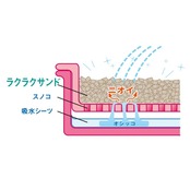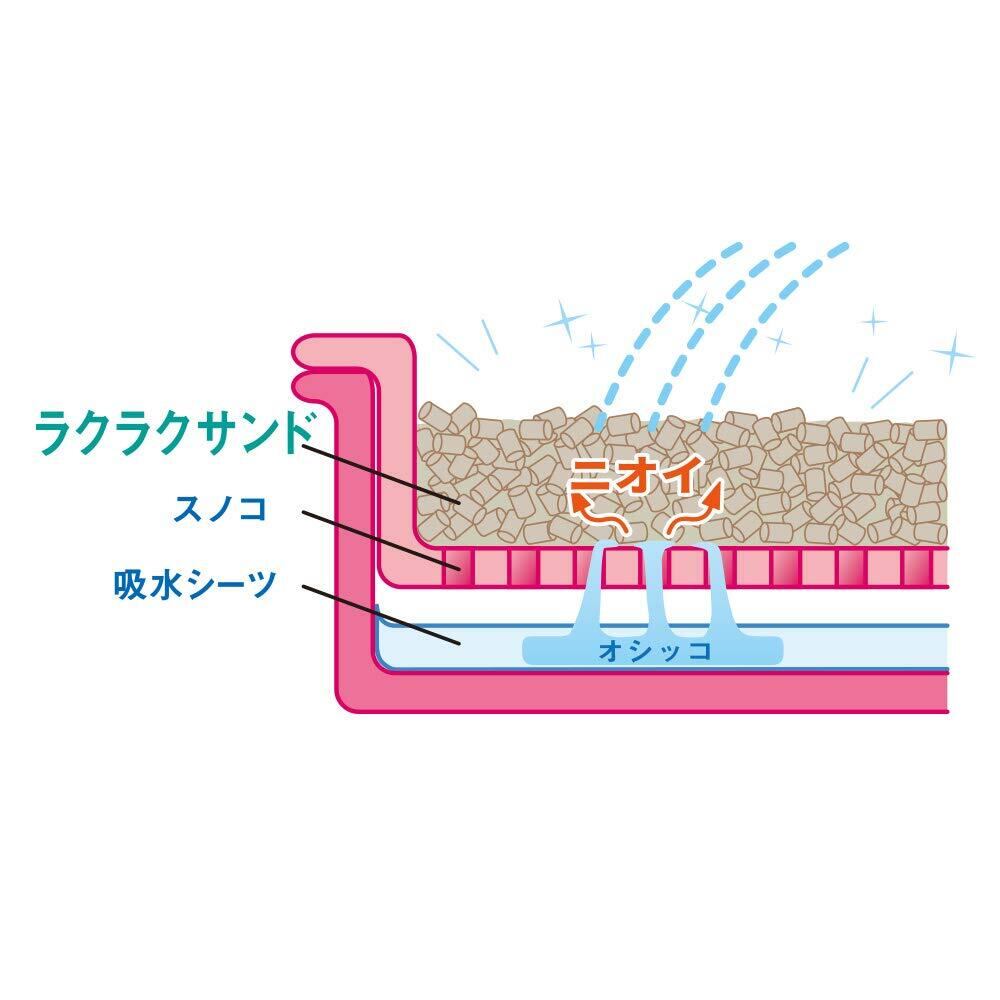 ラクラクサンドは吸水しませんので必ずペット用の吸水シーツと一緒にお使いください。尿だけを分別処理できます。尿はシーツが吸うのでニオイが広がりません。ラクラクサンドはいつもサラサラ! 固まらないのでフンもしっかり隠せます。ラクラクサンドの主原料は脱臭力に優れる天然ゼオライト。アンモニアをグングン吸着します。