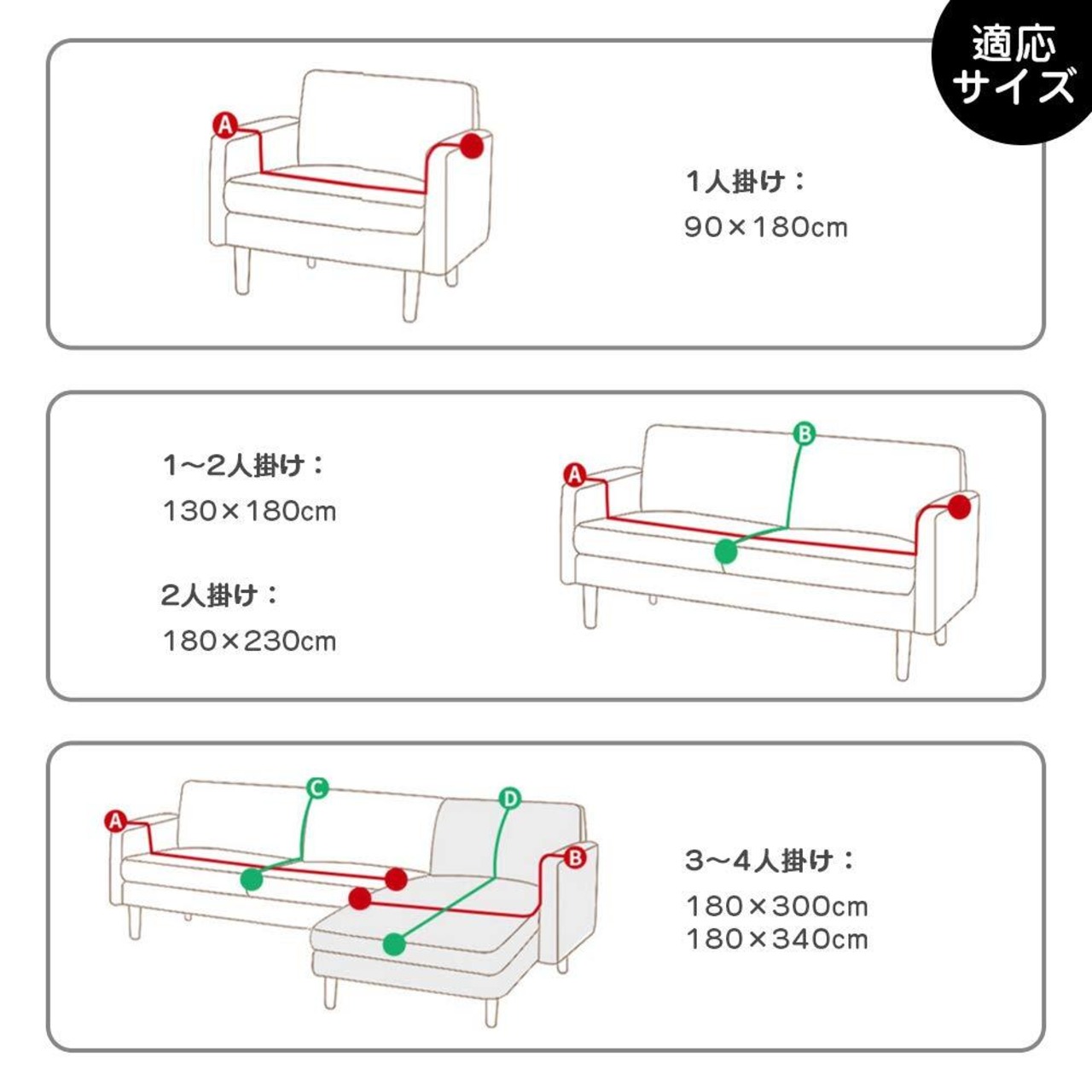 サイズ:90×180cm(1人掛け)、130×180cm(1~2人掛け)、180×230cm(2人掛け)、180×300cm/180×340cm(3~4人掛け)