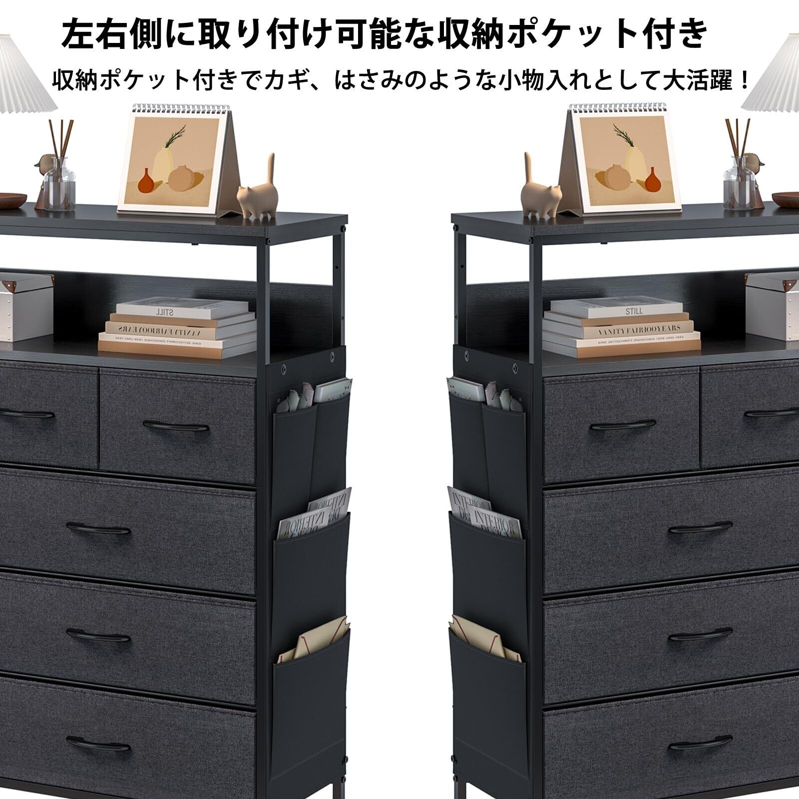 【特価商品】2口コンセント&2段棚 チェスト タンス 側面収納ポケット 衣装ケース 収納棚 洋服 衣類 収納 箪笥 おしゃれ キャビネット ハイチェスト リビング ランドリーチェスト 脱衣所 布製引き出し 整理タンス マルチチェスト(高通気性カチオン ブラック) | ニコニコSHOP