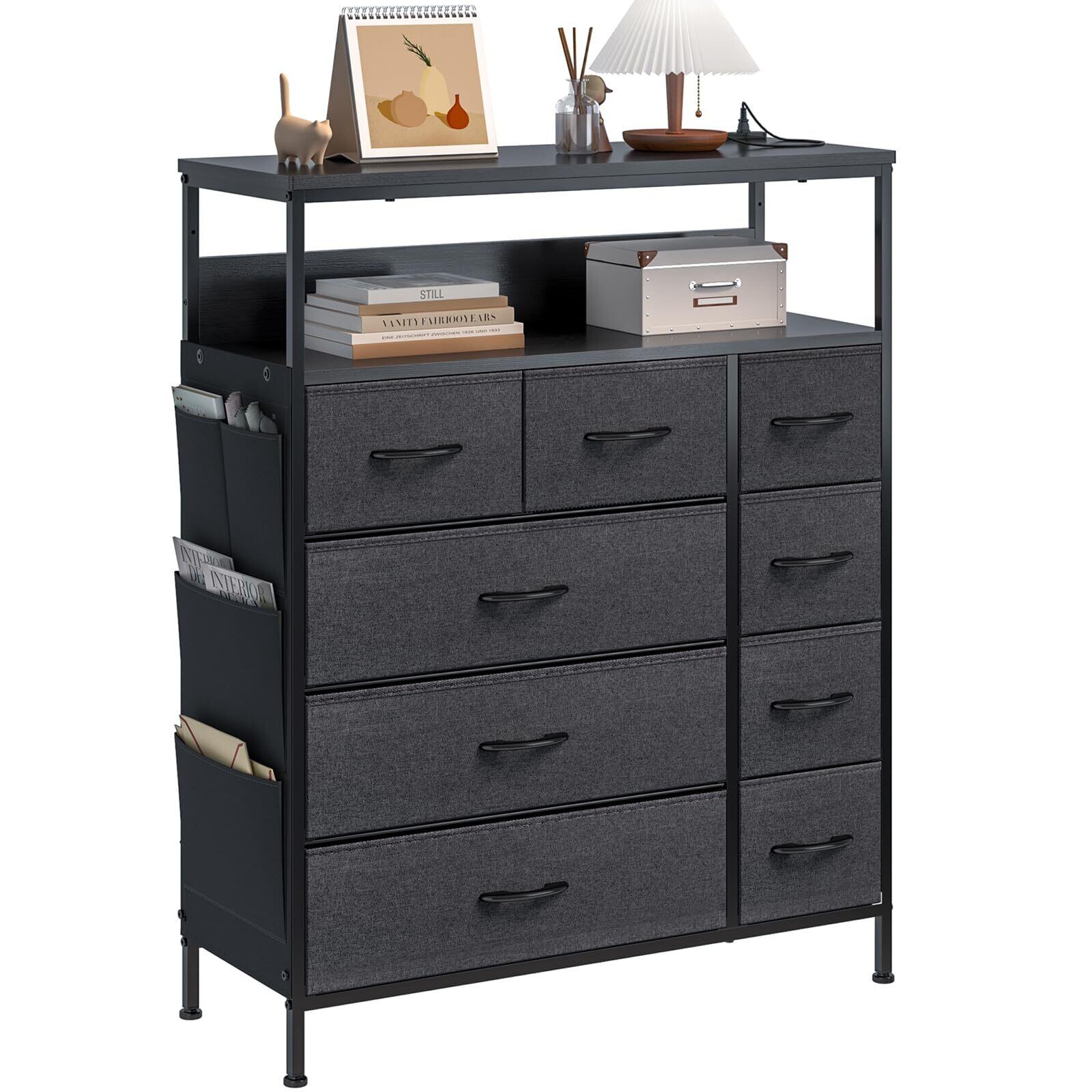 2口コンセント&2段棚 チェスト タンス 側面収納ポケット 衣装ケース 収納棚 洋服 衣類 収納 箪笥 おしゃれ キャビネット ハイチェスト リビング ランドリーチェスト 脱衣所 布製引き出し 整理タンス マルチチェスト(高通気性カチオン ブラック)