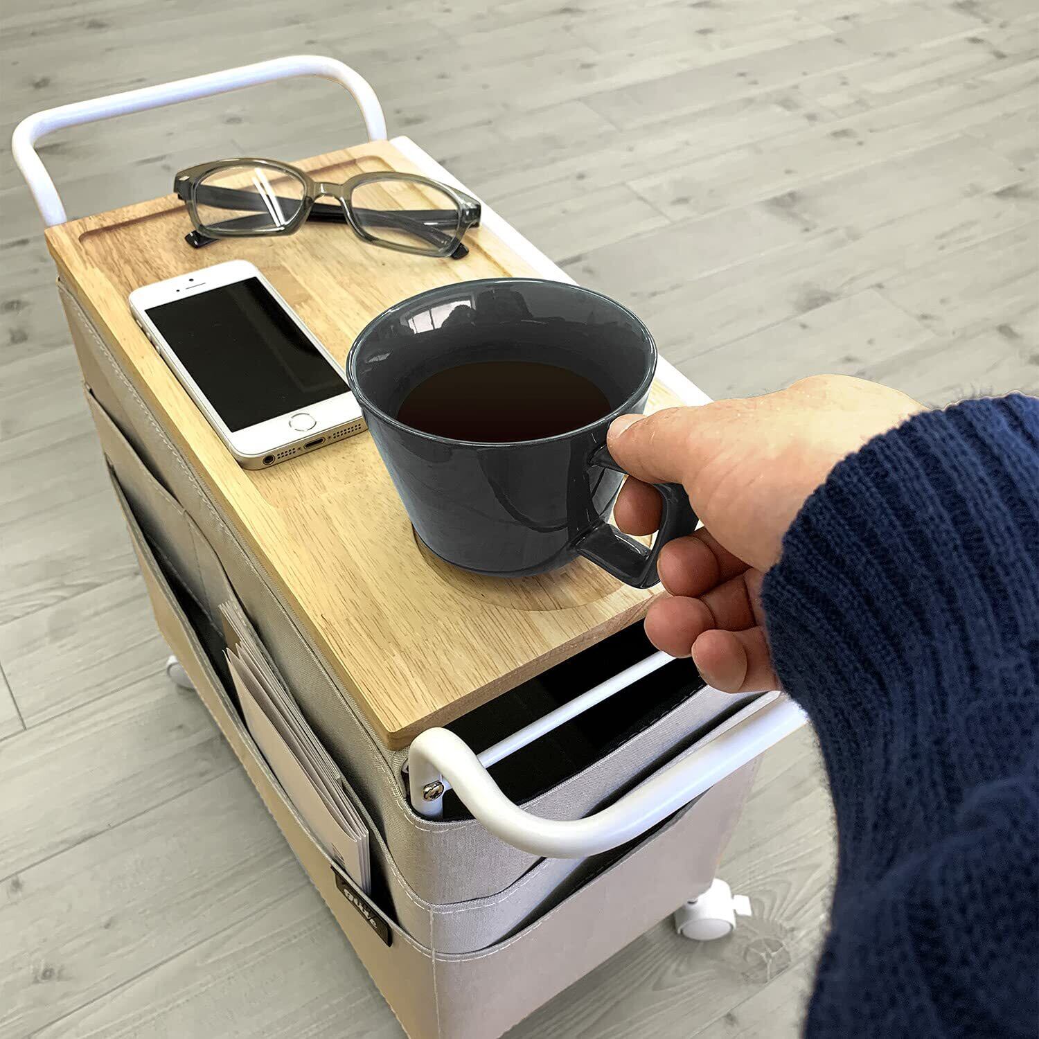 ワゴンの天板は天然木をトレー状に加工。スチールハンドルは天板スペースの使いやすさと移動のしやすさを両立させたハンドル形状。