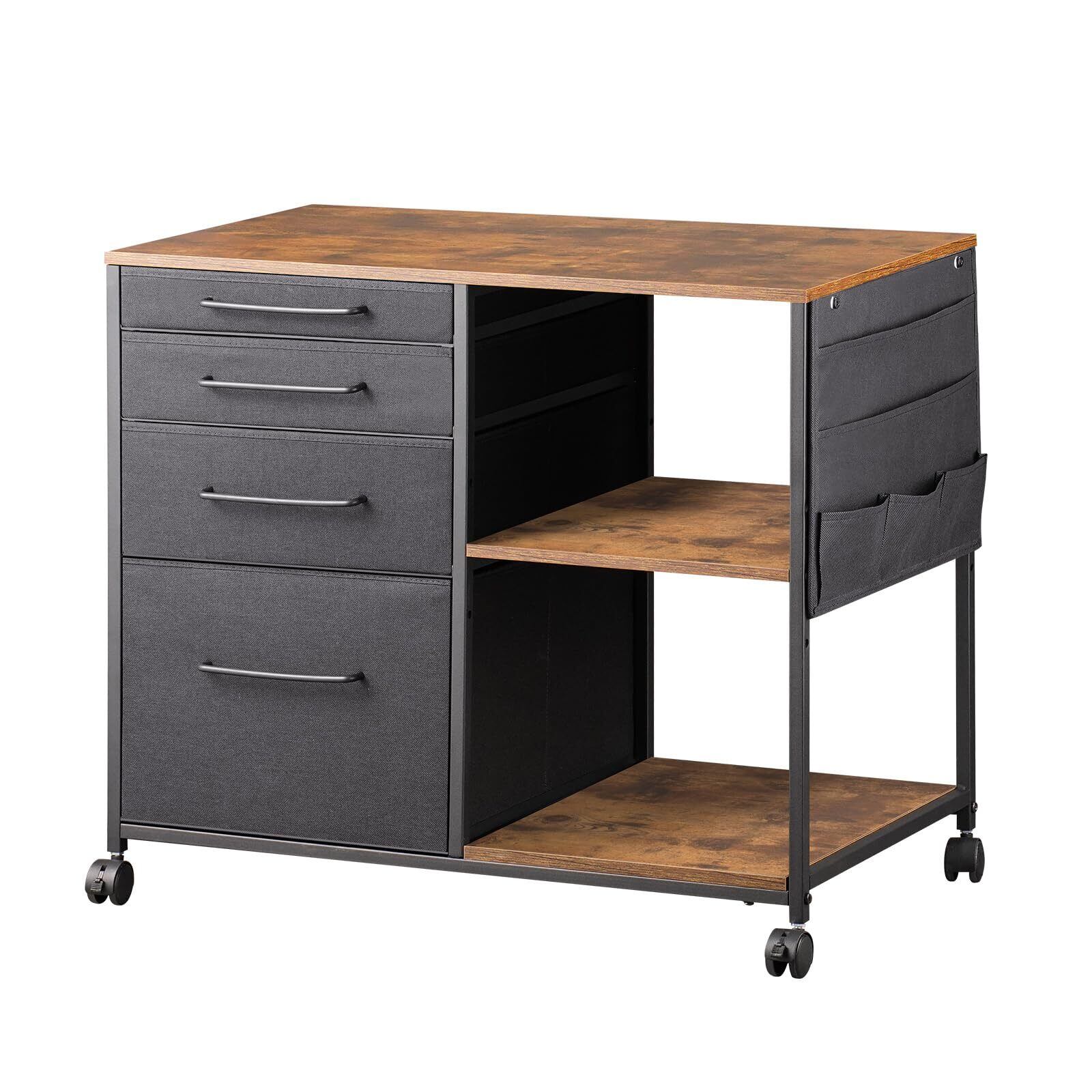 YeTom サイドキャビネット デスクワゴン 樹脂 布製 袖机 層板付き 4段 オフィスワゴン A4対応 プリンター台 大容量 キャスター付き デスク下収納 幅750*奥行400*高さ650mm ビンテージ+黒い引き出し