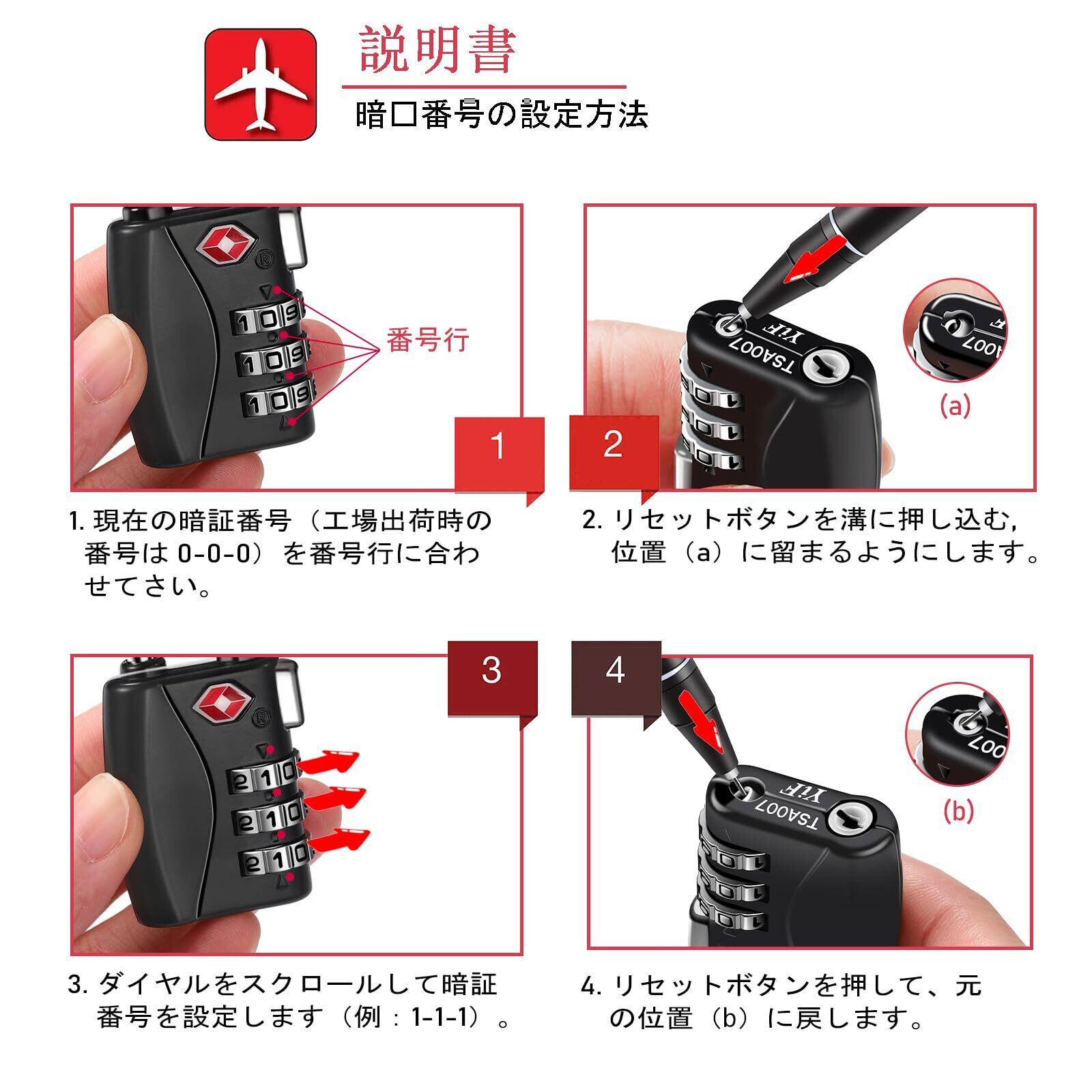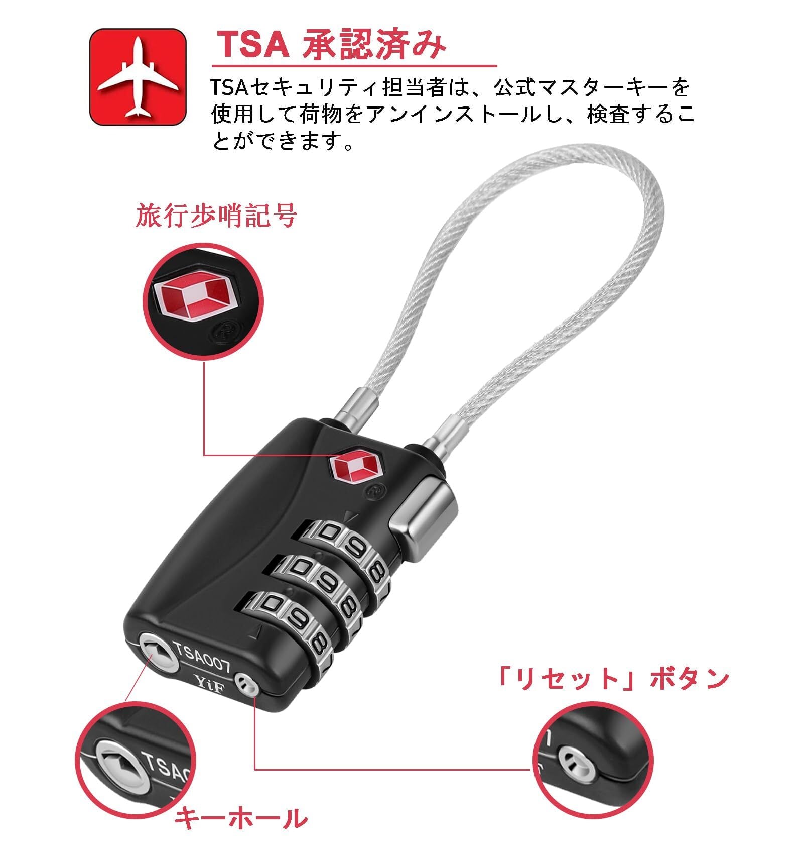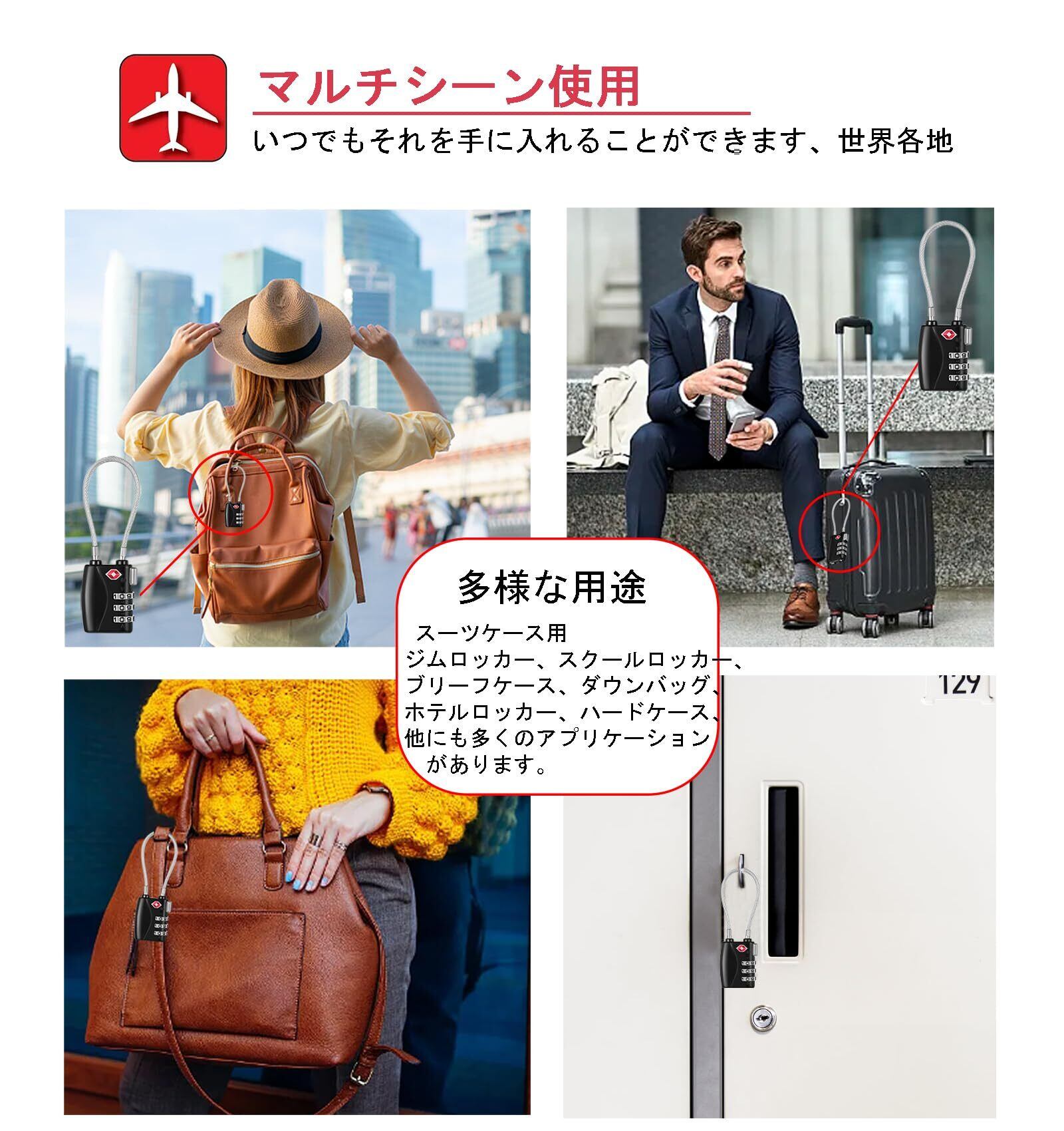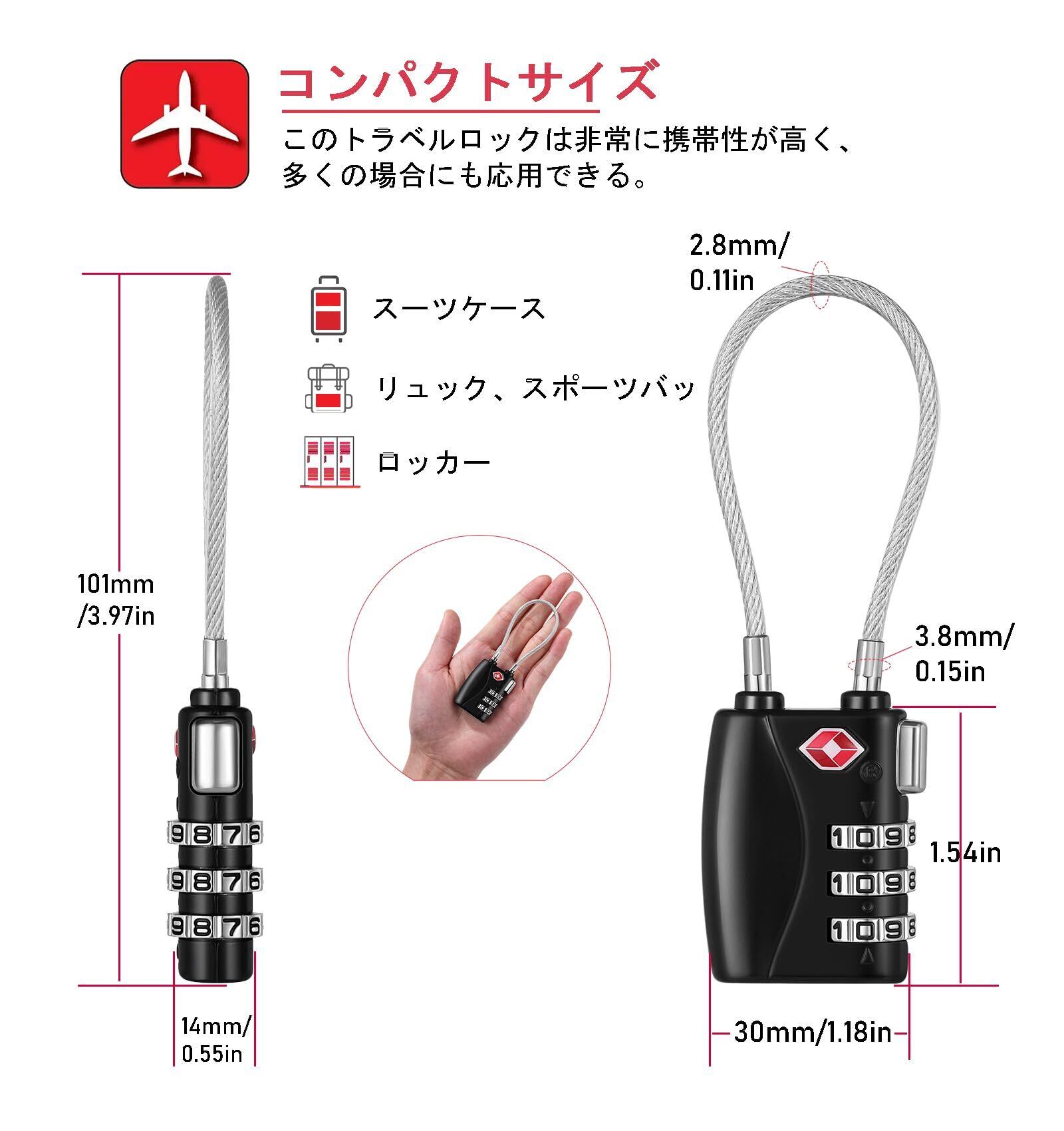 【新着商品】NAGE tsaロック 鍵 3桁 小型 ワイヤーロック 旅行 南京錠 鍵 スーツケース用鍵 盗難防止 バッグ用 キャリーバッグ バッグ 海外旅行 空港 検査 (ブラック-レッド) | ニコニコSHOP