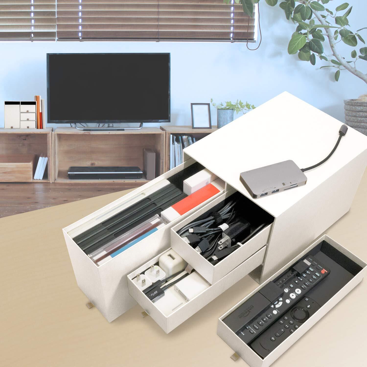 お部屋のこまごま、まとめて簡単整理。しっかりとした紙製収納ボックス。