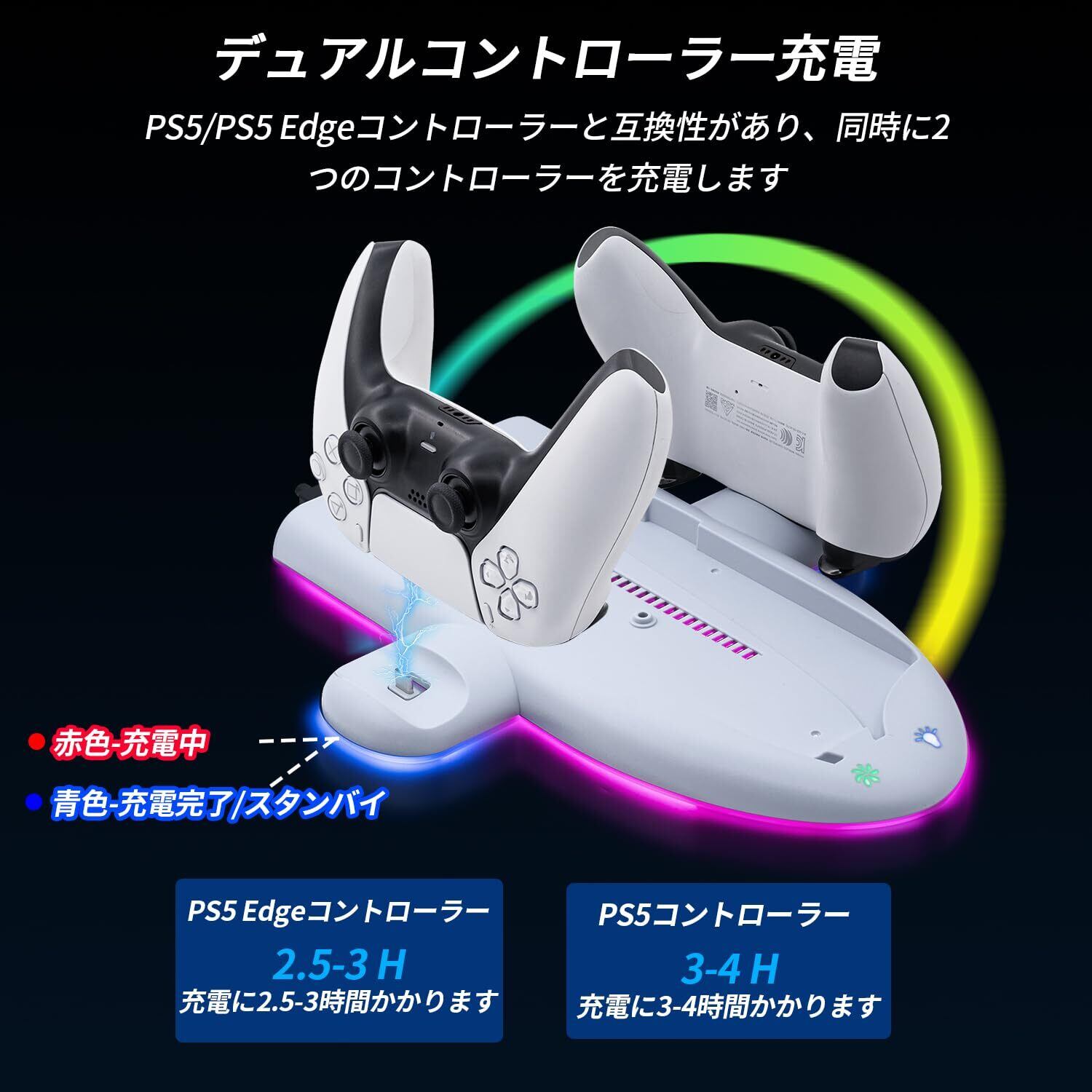 Mcbazel 新型 PS5 Slim対応 縦置き RGBスタンド 冷却ファン搭載 過充電防止 コントローラー 2台同時充電対応 省スペース ディスク/デジタル版兼用 PS5 Pro非対応- ホワイト