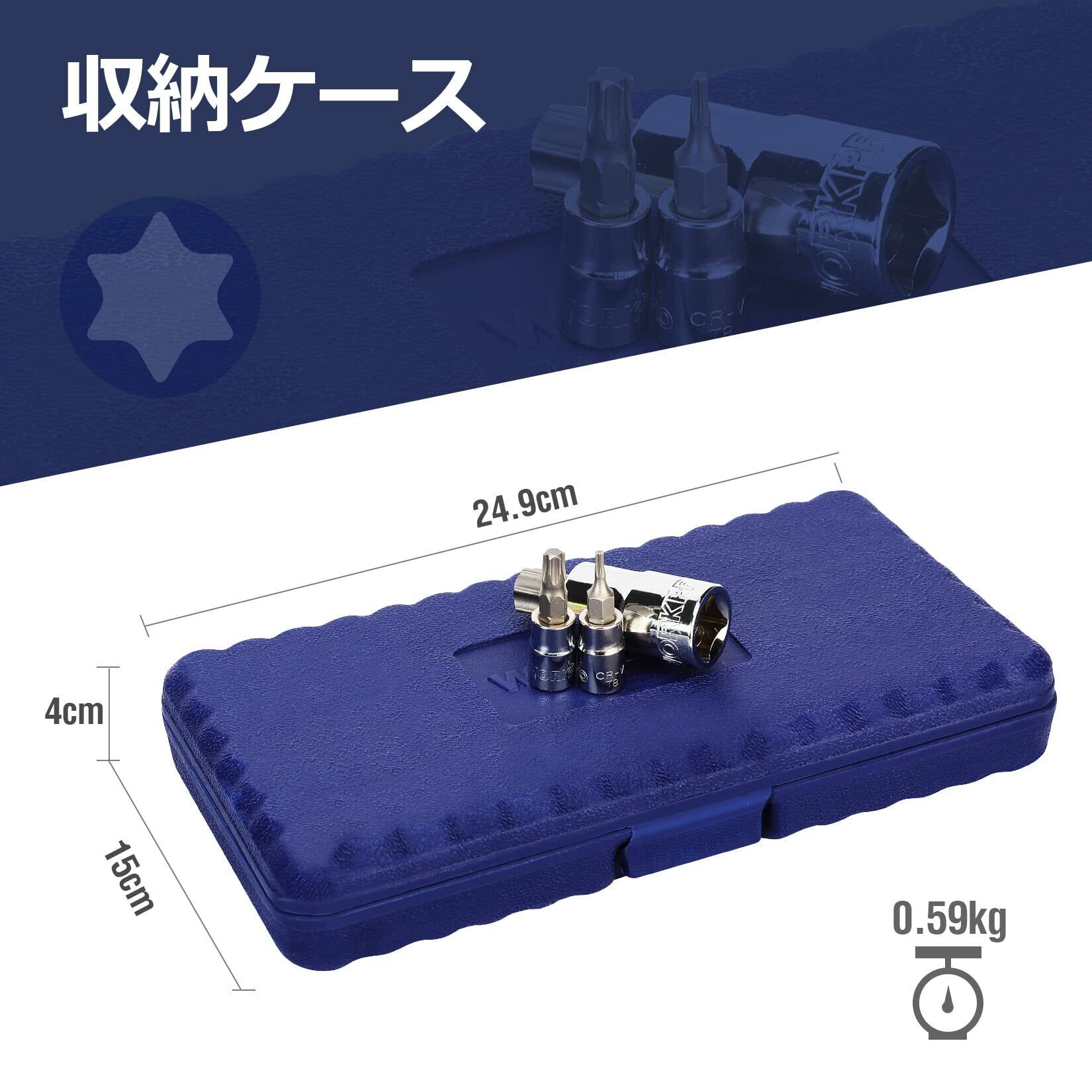 トルクスビットセット内容:軸径6.35mm(1/4インチ)T8、 T10、 T15、 T20、 T25、T27、 T30。軸径 9.5mm(3/8インチ) T40、 T45、 T47、 T50、 T55 。軸径12.7mm(1/2インチ) T60