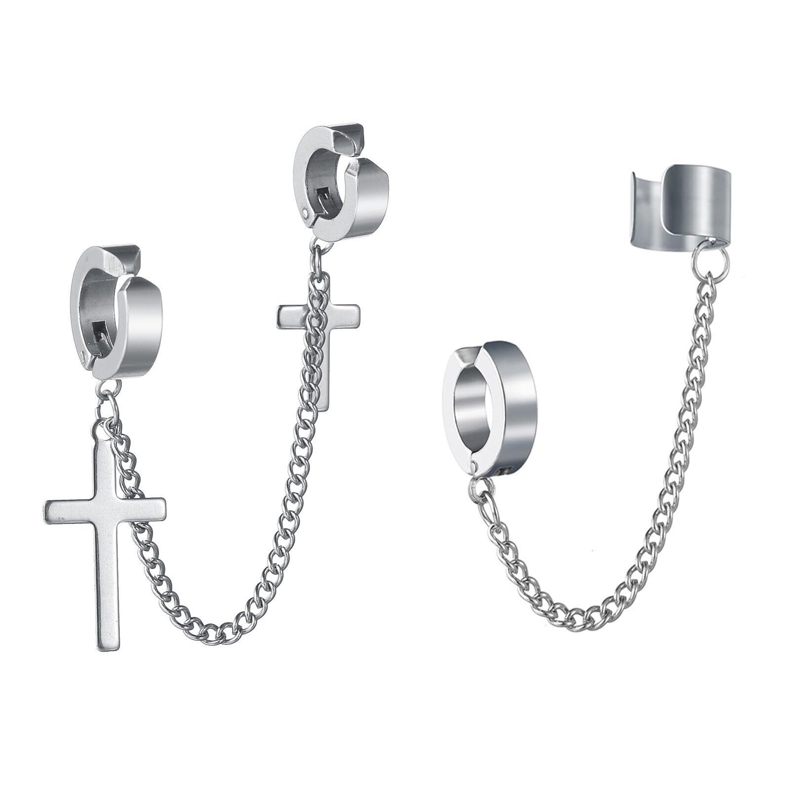 【韓国ファッションフェイクピアス】耳たぶ(イヤーロブ)と軟骨部分(ヘリックス)へ取付け可能のチェーンがたれ下がる片耳用イヤーカフ、フェイクピアスです。セットには大きさが違う2種類のチェーンにスティックが付いたタイプ 、たれさがる3つのチェーンにスパイクが付いたタイプという2種類の韓国風フェイクピアスが含まれています。定番のフープタイプにチェーンや各チャーム(スティックやスパイク、十字架)が付いた揺れるフェイクピアスチェーンです。