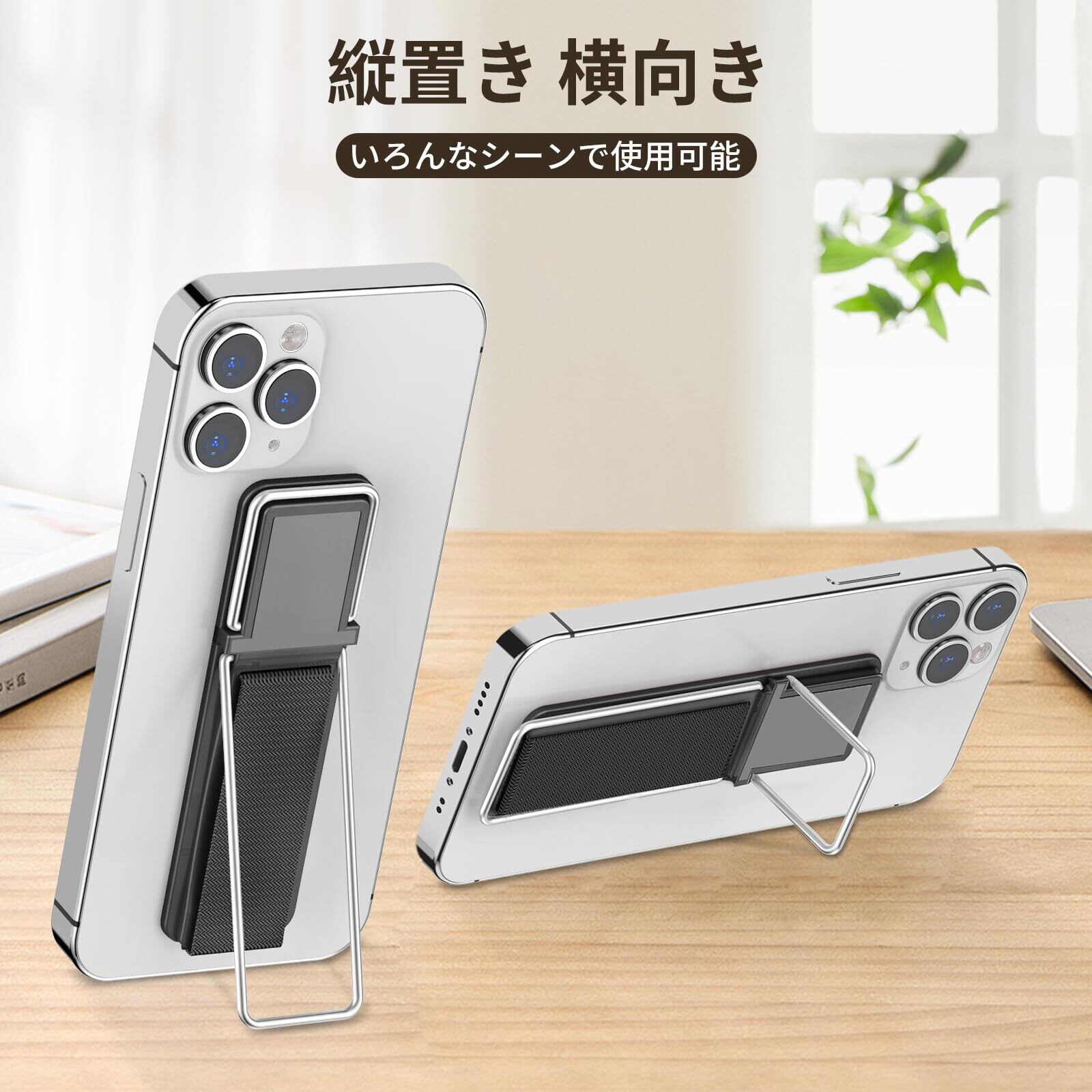 【3WAY使用】フィンガーストラップのおかけて、片手でスマホを操作できる。スマホスタンドとして、縦置き 横向きも全然問題ありません。金属が内蔵して、車載用ホルダーに固定することもできる。