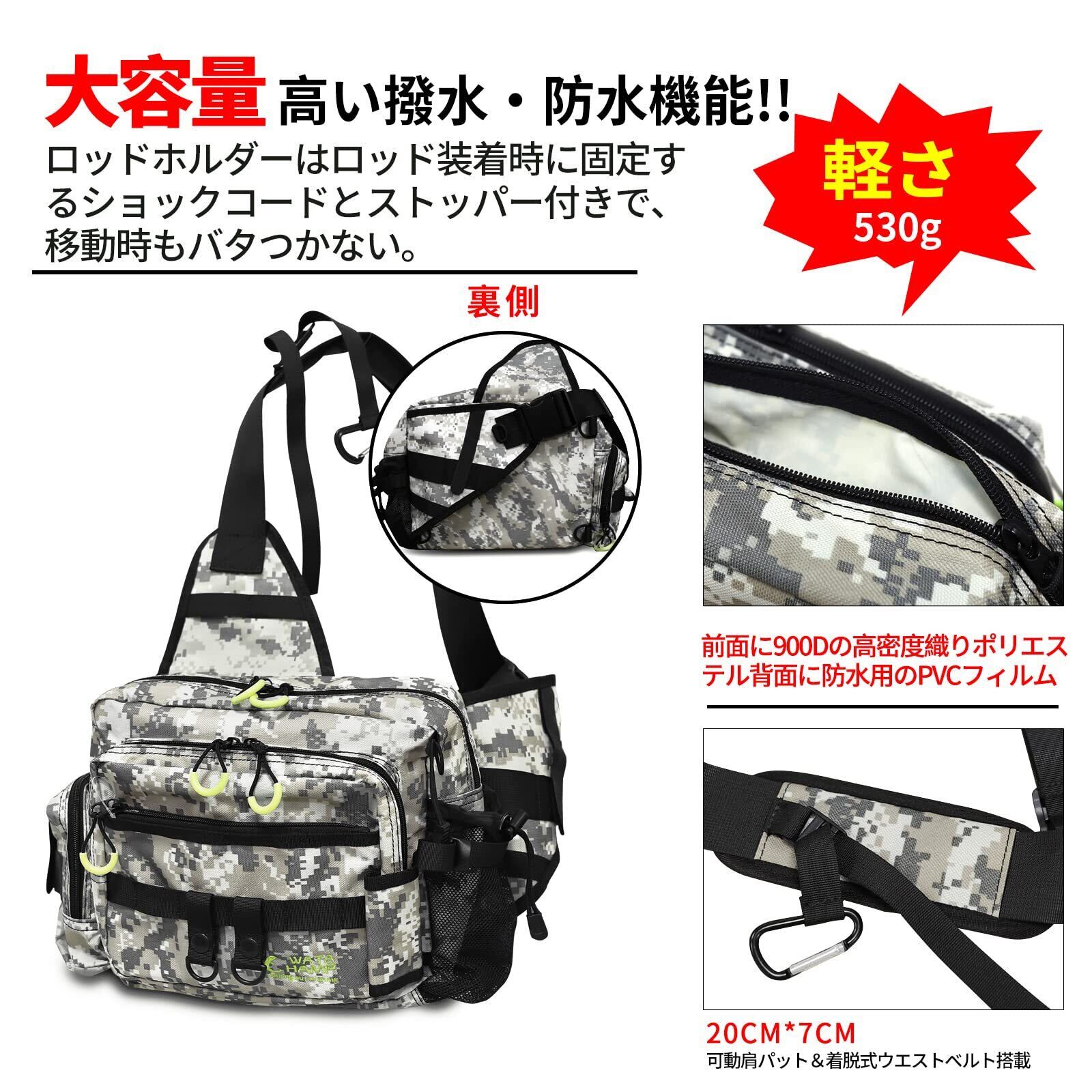 WATACHAMP【ワタチャンプ】釣り バッグ フィッシングバッグ 防水 5つカラビナ付き ダブルファスナー 可動式肩パッド 着脱式ウエストベルト タックルバッグ 多機能 大容量 釣り ショルダーバッグ 【 カモしろい カモグリーン カモカーキ カモインク カモシアン 】