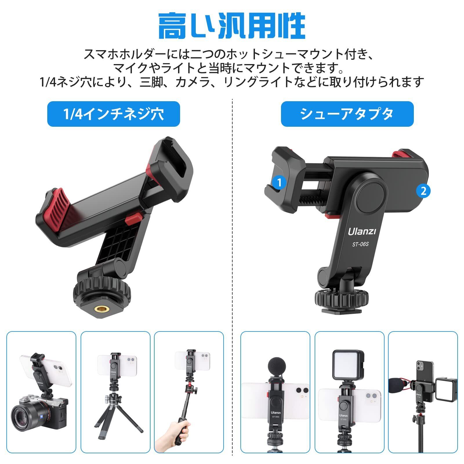 【最新のST-6S携帯ホルダー】三脚スマホホルダーの両側にはコールドシューマウントがあり、マイクやLEDライトを両側に取り付けることができます。三脚ホルダーの下にはシューアタプタと1/4インチネジ穴により、三脚、一脚、自撮り棒、スタビライザー、カメラ、LEDライト及び他のデバイスに取り付けられます。vlogの撮影するのに役立ちます。 ビデオ撮影のベストパートナー。