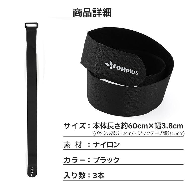 【サイズ】本体長さ:約60cm × 幅約38mm(バックル部分:2cm/マジックテープ部分:5cm)【素材】ナイロン 【カラー】ブラック 【入り数】3本 【製造国】中国