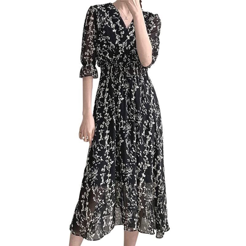 【新春セール】[slenderlady] スレンダーレディ〕ワンピース レディース 花柄 ロング 夏 半袖 パフスリーブ vネック マキシ丈 シフォン 薄手 涼しい ウエストゴム きれいめ リゾート フェミニン 上品 女らしい 220706T-R | ニコニコSHOP
