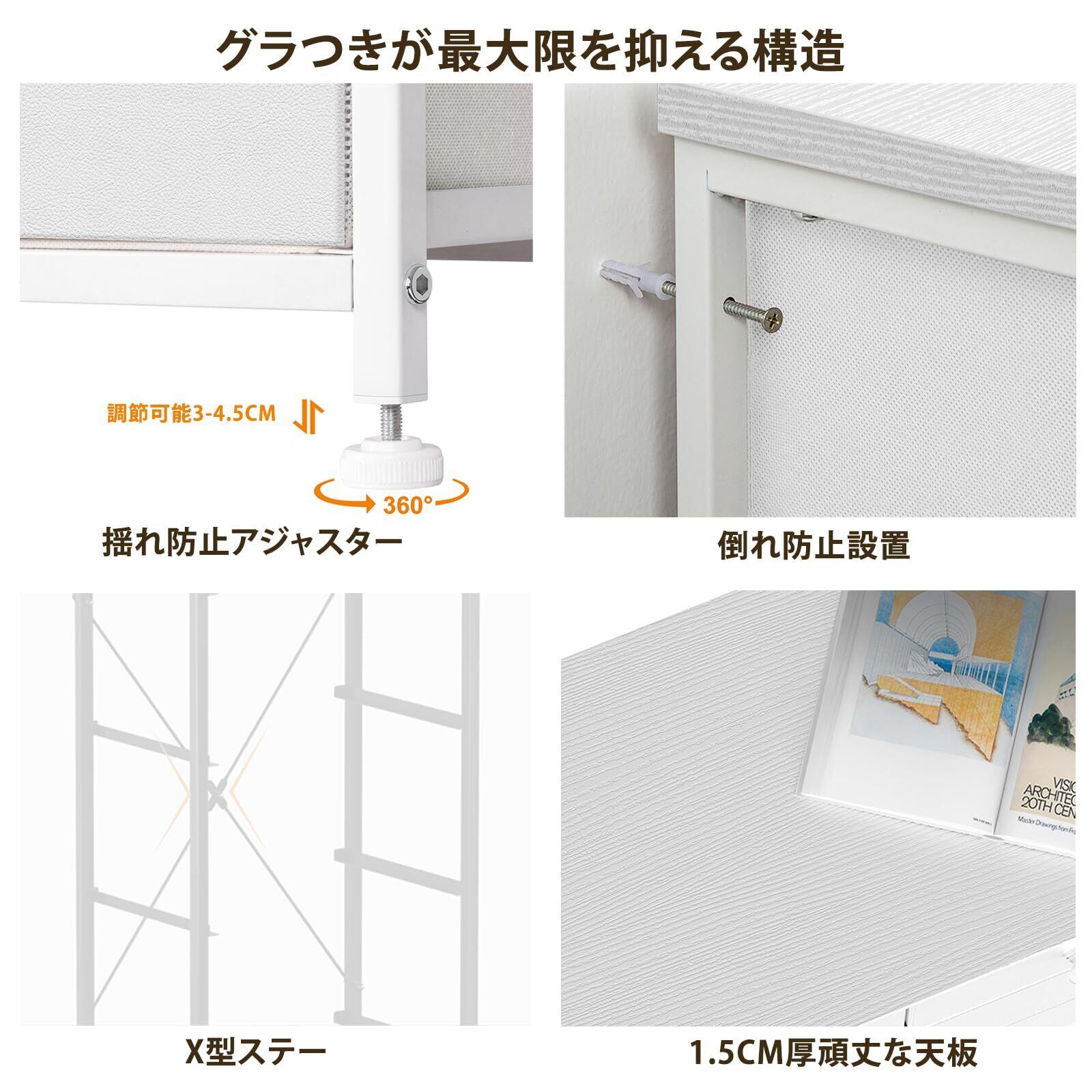 【転倒防止もバッチリ】シリーズ全品に壁用固定具と専用アジャスターが付属。さらに床に優しいフェルトも付属しており、フローリングの傷防止に。