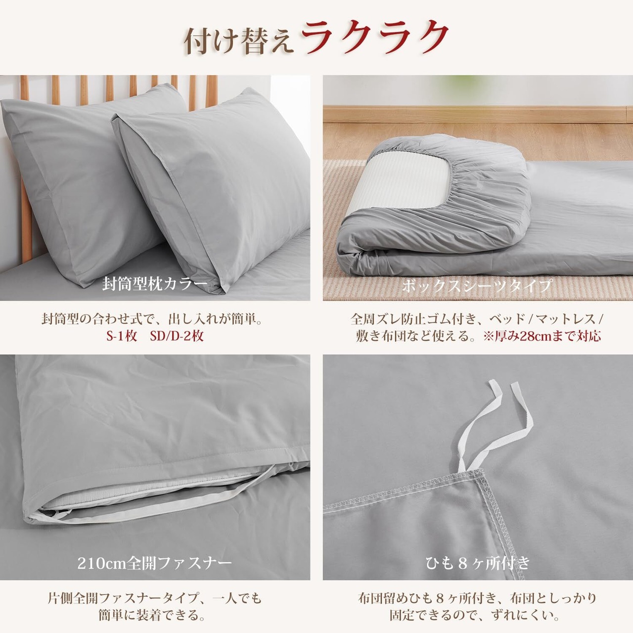 <セット内容&仕様>:「掛け布団カバー(1枚)」:片側に210cm全開ファスナー使用 / 布団留めひも8ヶ所付き ・ 「ボックスシーツ(1枚)」:全周ズレ防止ゴム付き / 通常サイズより大きめなので、高さ3-28cmの敷き布団とマットレスの底まで包む可能 ・ 「枕カバー(2枚)」:封筒型で、出し入れが簡単