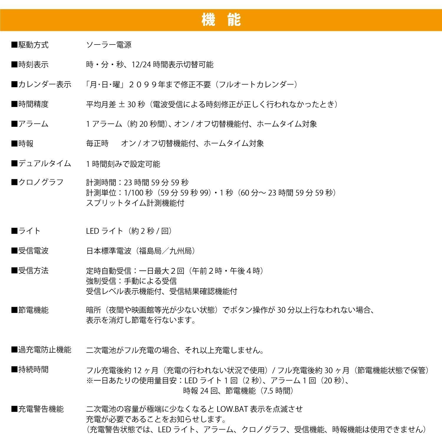 その他機能:電波受信機能 (日本標準電波・福島局/九州局)、時報 (毎正時・オン/オフ切替機能付き)、デュアルタイム、クロノグラフ (スプリットタイム機能付)、LEDライト (デジタル部)、節電機能、過充電防止機能、充電警告機能、フル充電時持続時間 (30ヶ月)