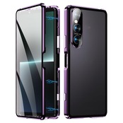 全面カバーXperia 1 VI 用 ケース クリア [SO-51E / SOG13] カメラ保護フィルム付き アルミバンパー ガラスフィルム ロック付き マグネット式 エクスペリア1 VI 用カバー 両面ケース バンパーケース 透明, 紫