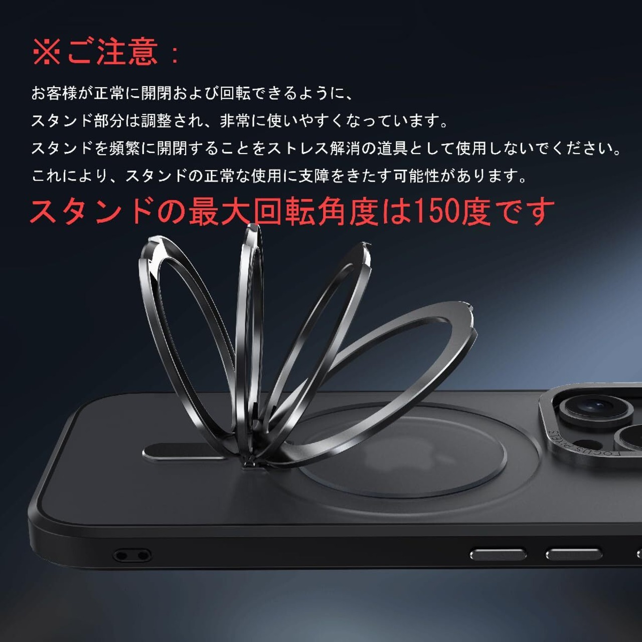 【MagSafe対応】超世代的な隠しスタンドと強力なマグネットリングの強力な結合により、高い吸着力でガッチリと固定しながら充電ができます。安定性を持ち、充電器を近づけると高速ワイヤレス充電が実現です。また、磁気を利用しているため充電器以外にもスタンドやウォレットなどのアクセサリーに固定可能。