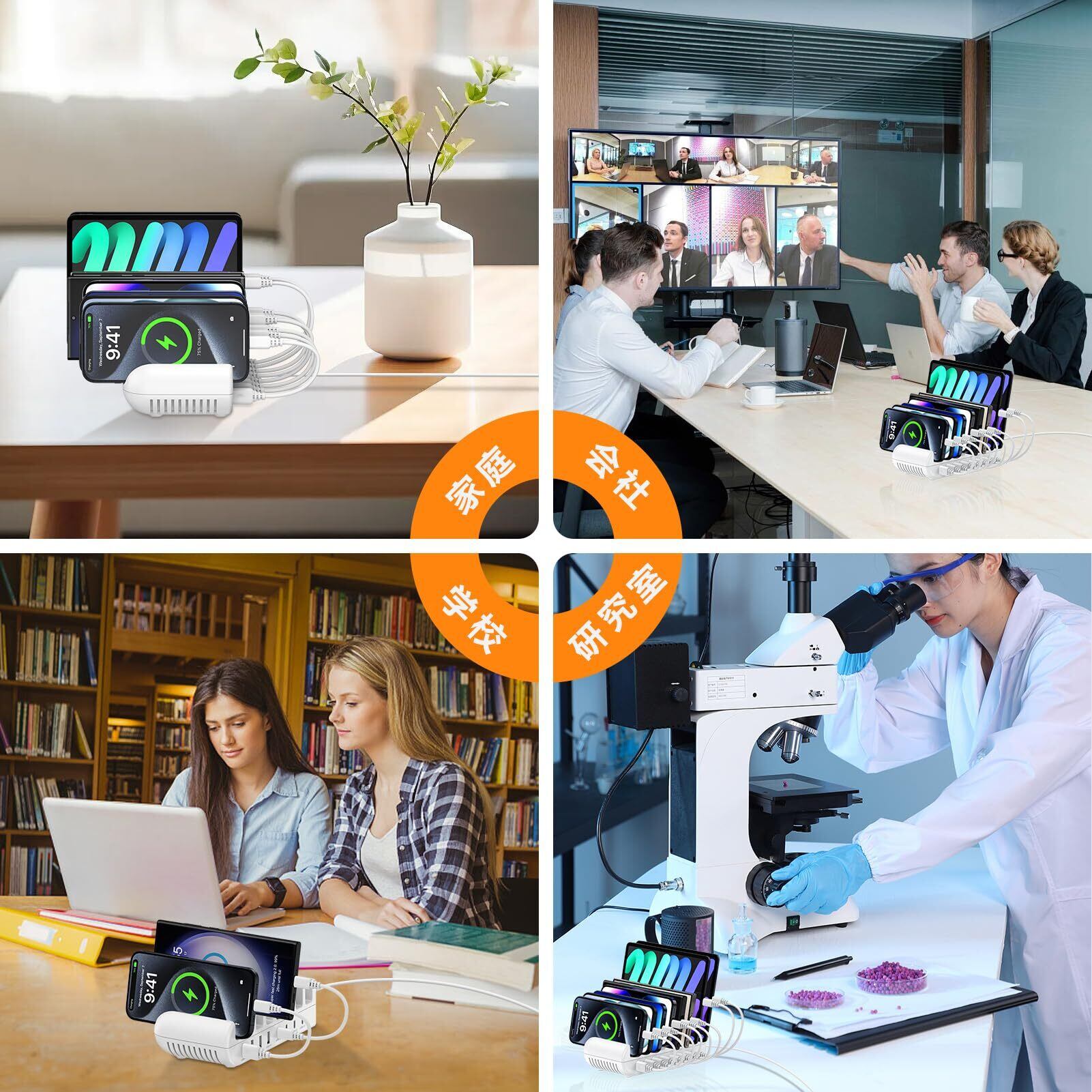 【チャージ&クリーン&整理】雑然としたケーブルはもう不要です、 充電器の束なし、 すべてが1か所に 清潔で整理されています。 白いマットな表面、 水色のLED、 スペースグレイシリカゲルストリップ、 組み合わせて、これを真のプレミアム充電ステーションにします。 どこにでも合うように設計されており、 会社、オフィス、会議室、家、居間、寝室、台所、ホテル、レストラン、教室。