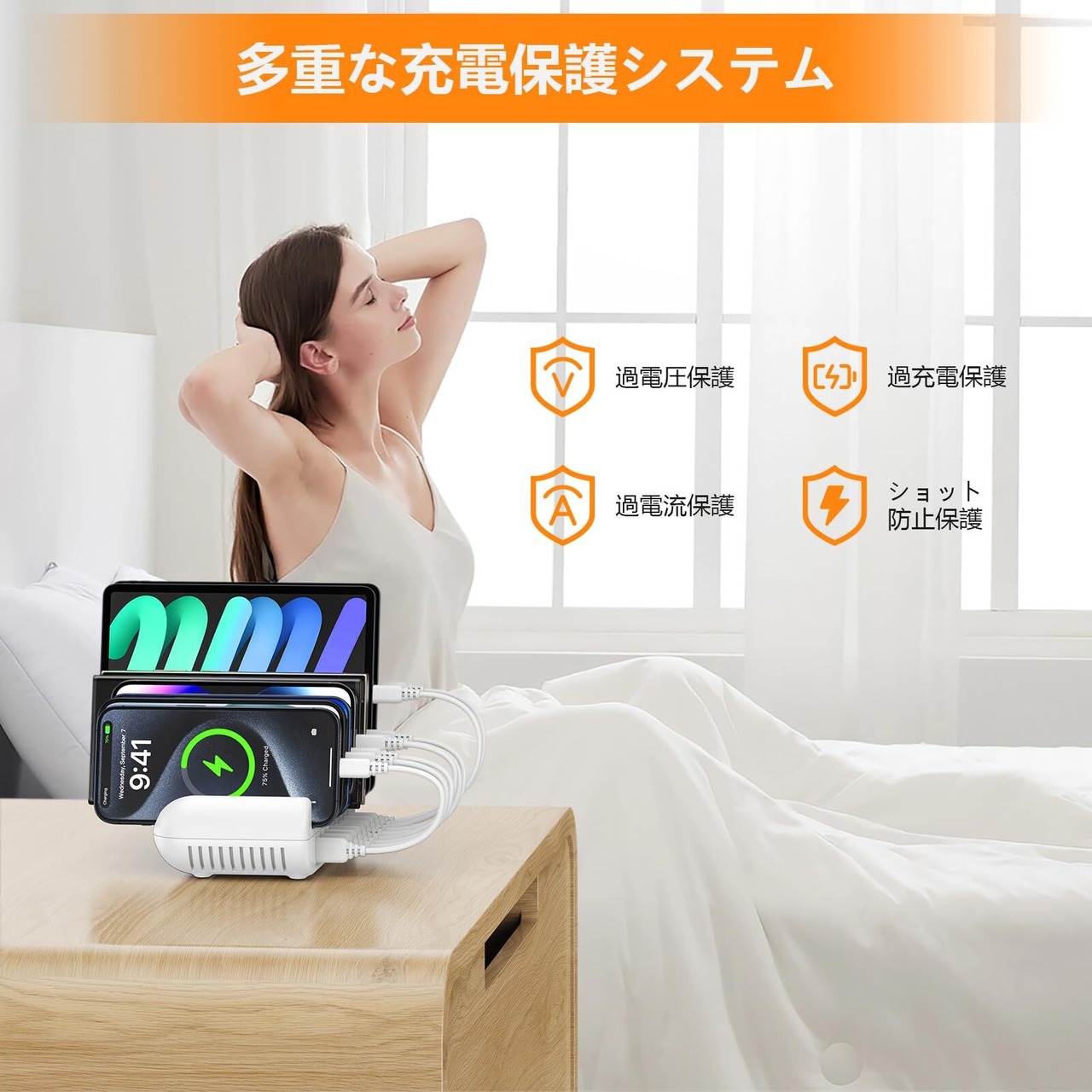【65Wパワー&8台同時充電タイプ】4PDポートと4QCポートまとめて合計65W出力です。付属の仕切り板で最大8台のモバイル機器をキレイに置けます。収納しながら充電できます。スマートIC内蔵で充電中、USBデバイス端末に適した最適な電圧を自動的に調整できます。(ご注意:充電ケーブルは別売りです。)