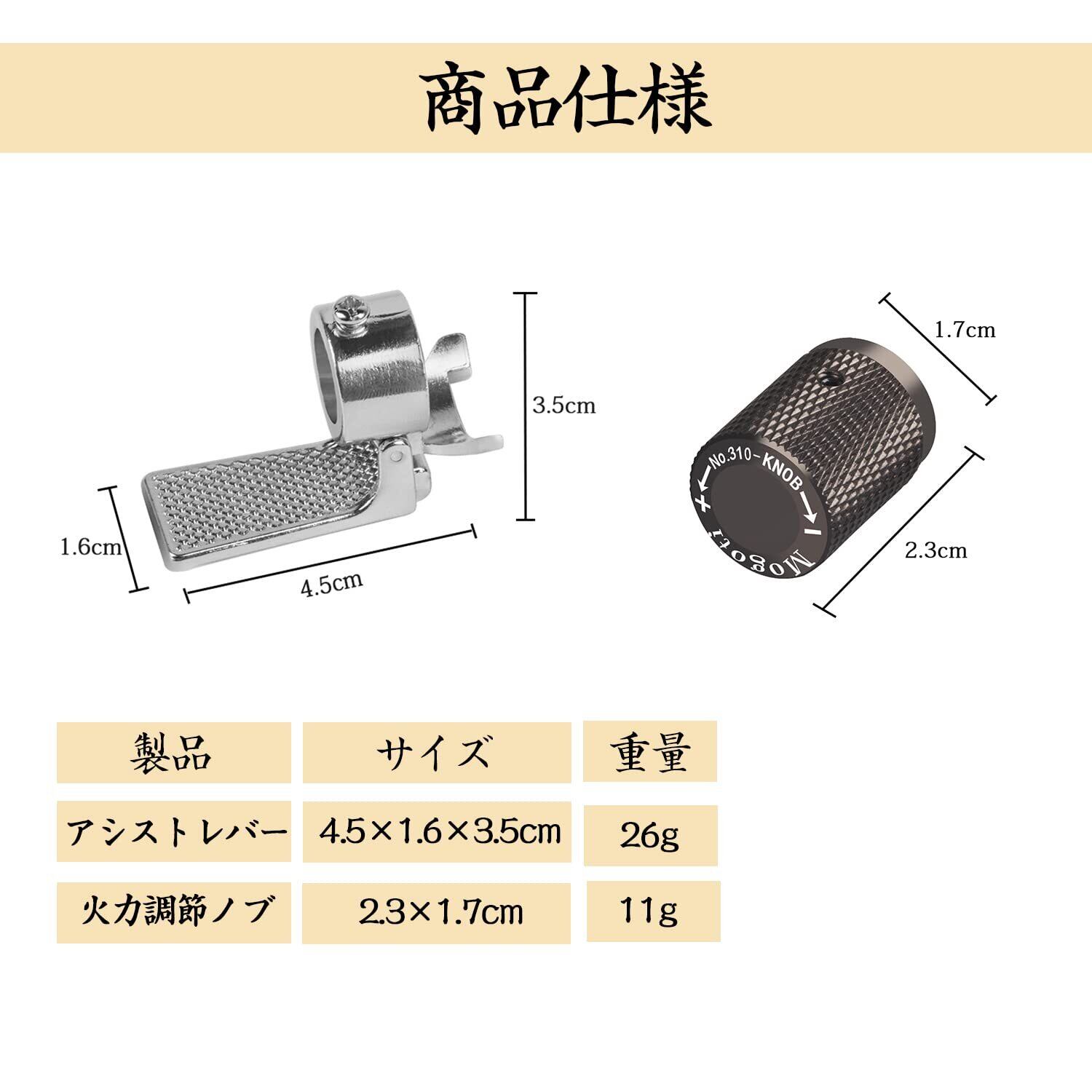 【商品仕様】火力調節用ノブ:外径:1.7cm 長さ:2.3cm 重量:11g 付属品:六角レンチx1。点火アシストレバー:材質:合金 重量:26g サイズ:4.5×3.5cm 。