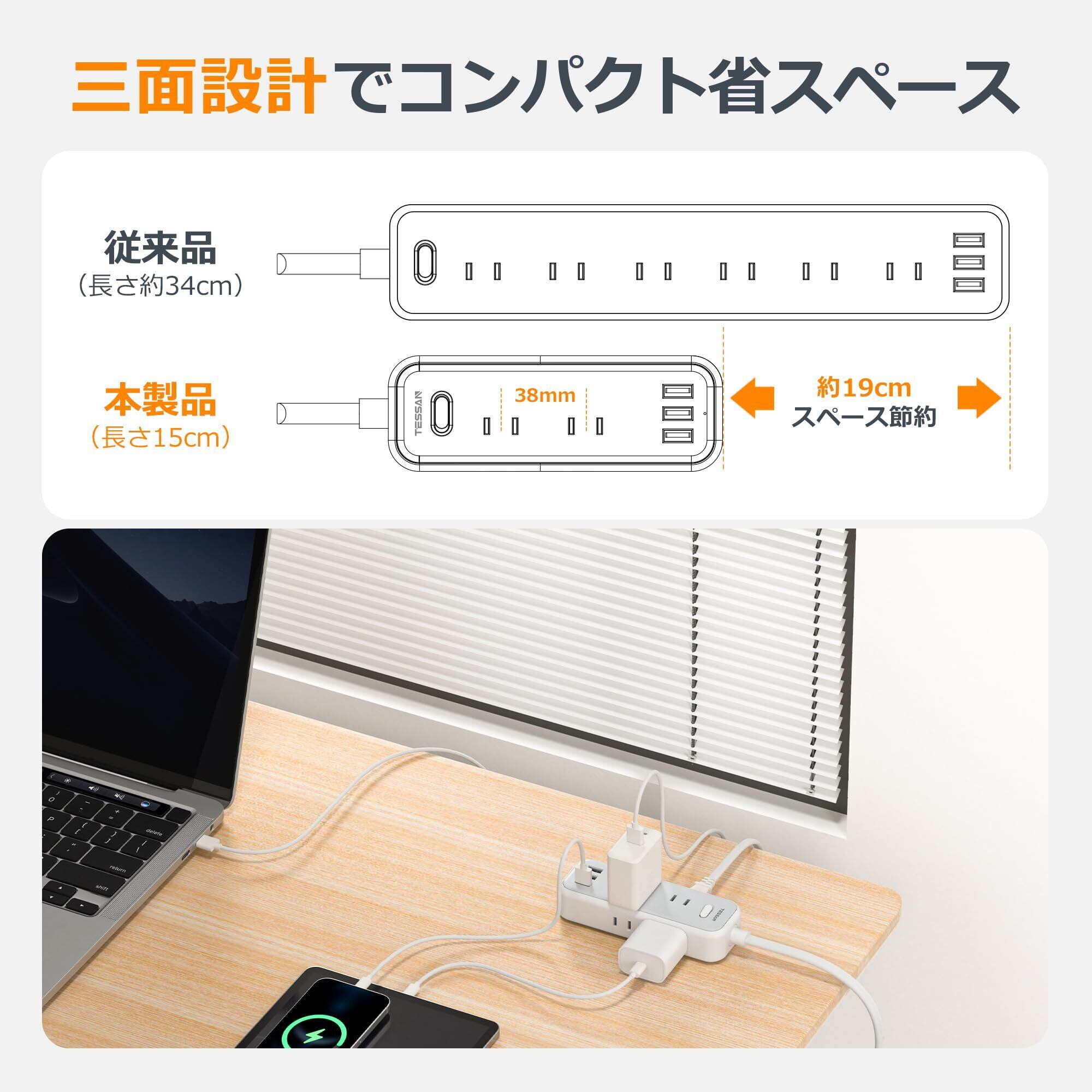 【互いに干渉しないたこあし コンセント】デーブルタップはタコ足配線の設計を採用しており、AC差込口が三方向に分配されて、ACアダプター同士を挿入しても隣コンセント干渉しません。タップコンセントとUSBポートは両面配置の蛸足コンセントで設計されており、配線がスッキリしています。