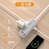 【一台9役のコンセントタップ】USBポート3個とAC電源コンセント6口を備えており、合計9台の機器を同時に充電できるマルチタップです。ACコンセントの出力は最大1500Wで炊飯器、ドライヤーなど消費電力の高い電化製品が使用可能です。
