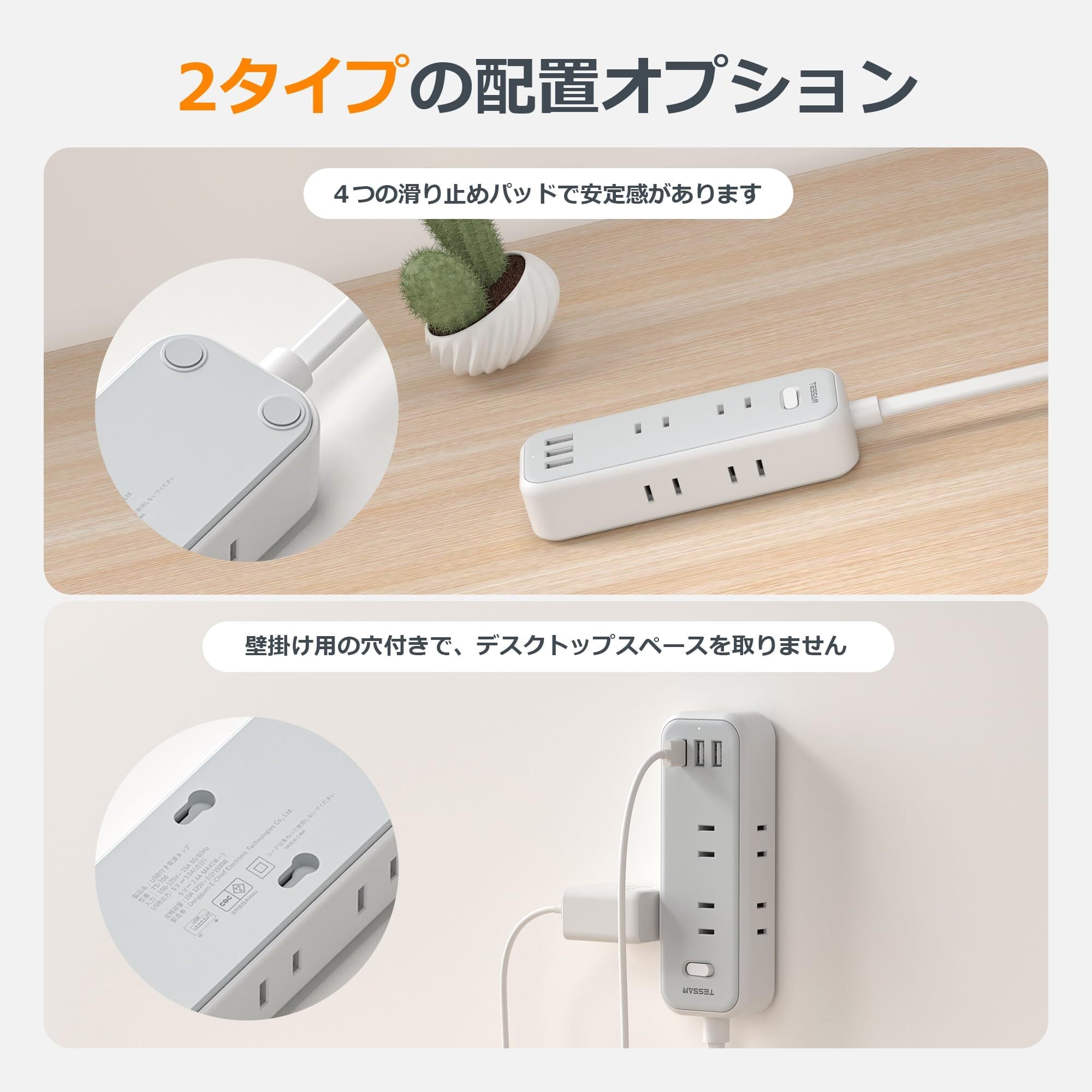 【在庫セール】電源タップ usb付き 延長コード 2m 雷ガード usb コンセント TESSAN 薄型 たこあしコンセント 6口 oa スイッチ付き 延長コード 薄型プラグ 壁掛け タコ足配線 マルチタップ 6個AC差込口 3つType-Aポート たこあし配線 分岐 小型軽量 コンパクト 3つ方向 充電 一括スイッチ付き 壁掛け/卓上に | ニコニコSHOP