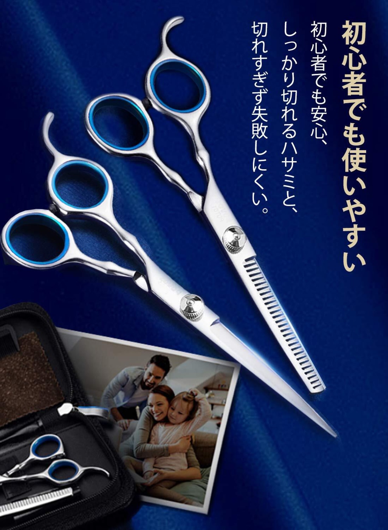 自宅で手軽にヘアカット 両はさみには小指かけ、ヒットポイントなど持ち手の細かい工夫が施されているため、プロでも初心者でも使いやすい作りになっています。自宅でのセルフカット用、子供の髪の毛を切りました。