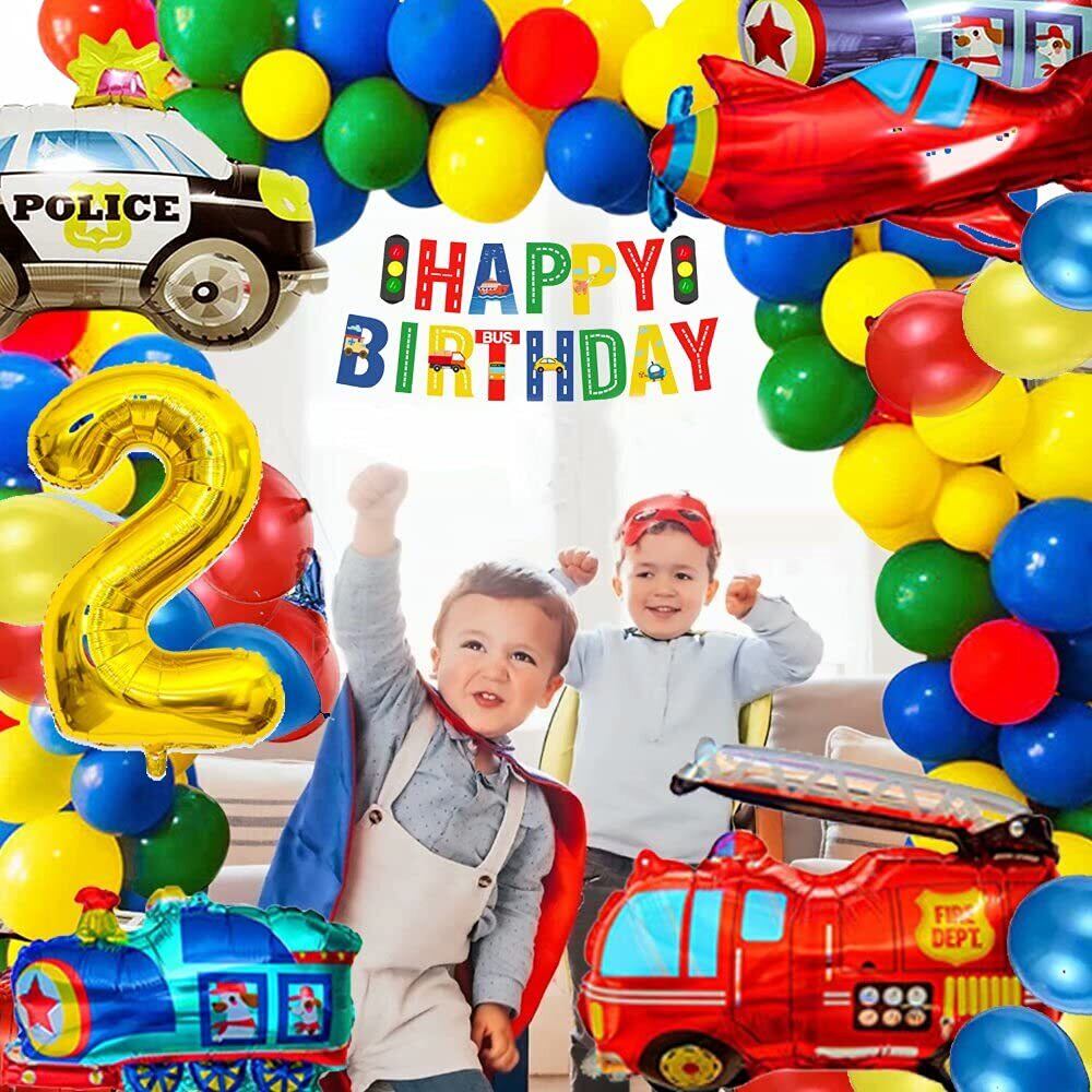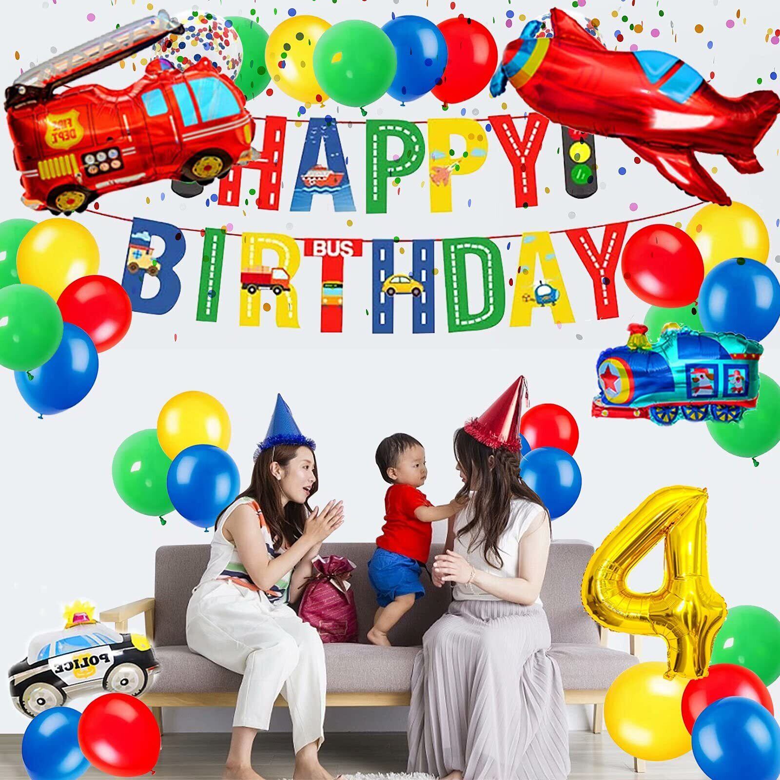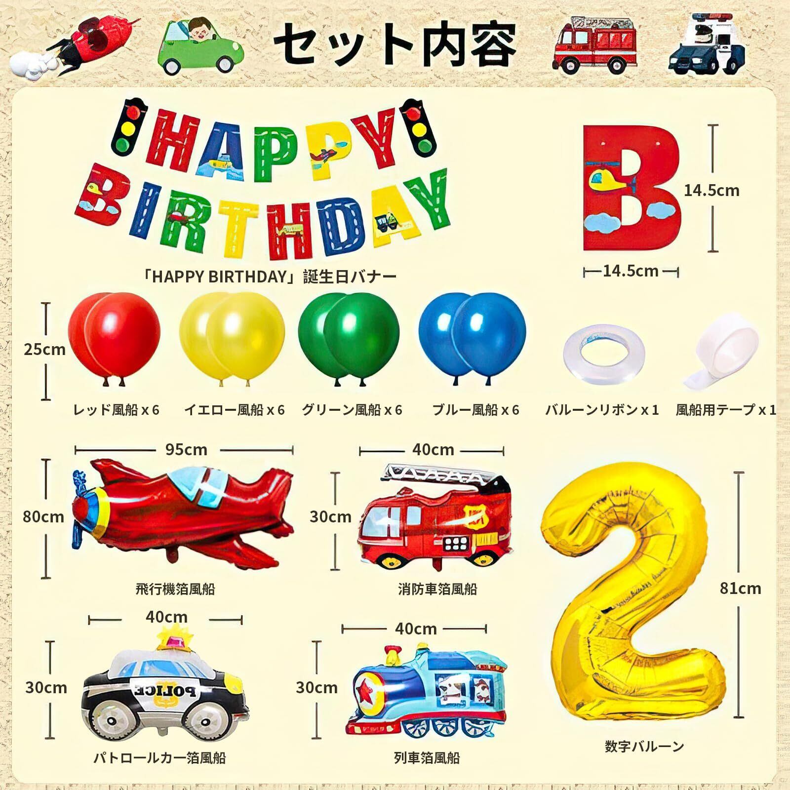 「誕生日 バルーンセットの内容」①81cm数字バルーンx1 ②25.4cmゴム風船x24(赤色、青色、黄色、緑色) ③アルミ風船x4(飛行機*1、列車*1、パトロールカー*1、消防車*1) ④「HAPPY BIRTHDAY」バナーx1 ⑤リボンx1 ⑥ドットグルーx1 男の子が大好きな車テーマ誕生日 飾り付け セット、素敵なバースデー 飾り!