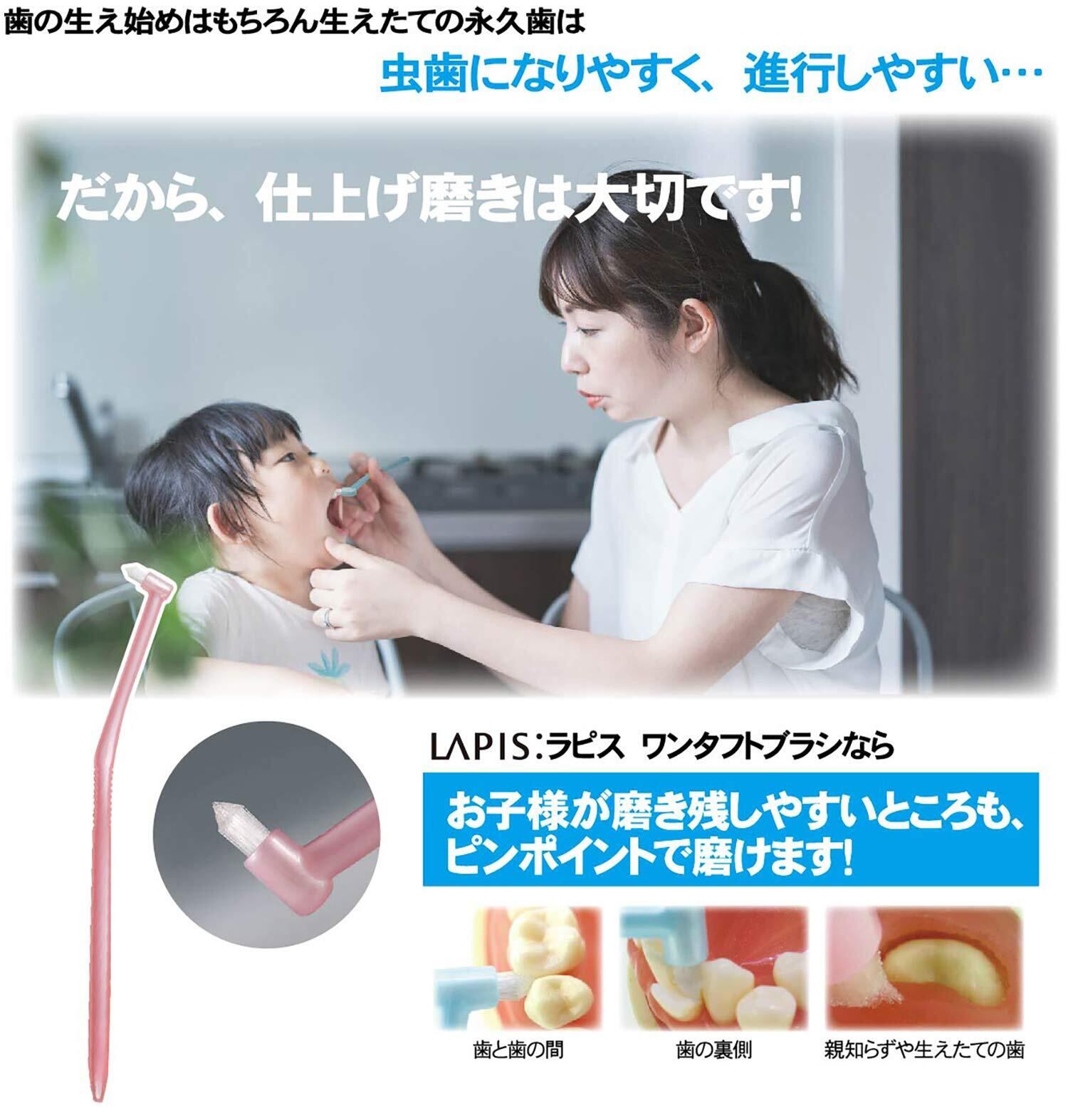 歯間部分、矯正部分の清掃に優れています。奥歯までしっかり届きます。お子様の細部の仕上げ磨きにも使っていただけます。