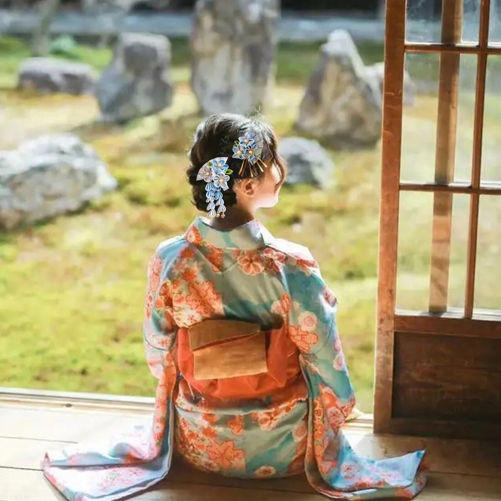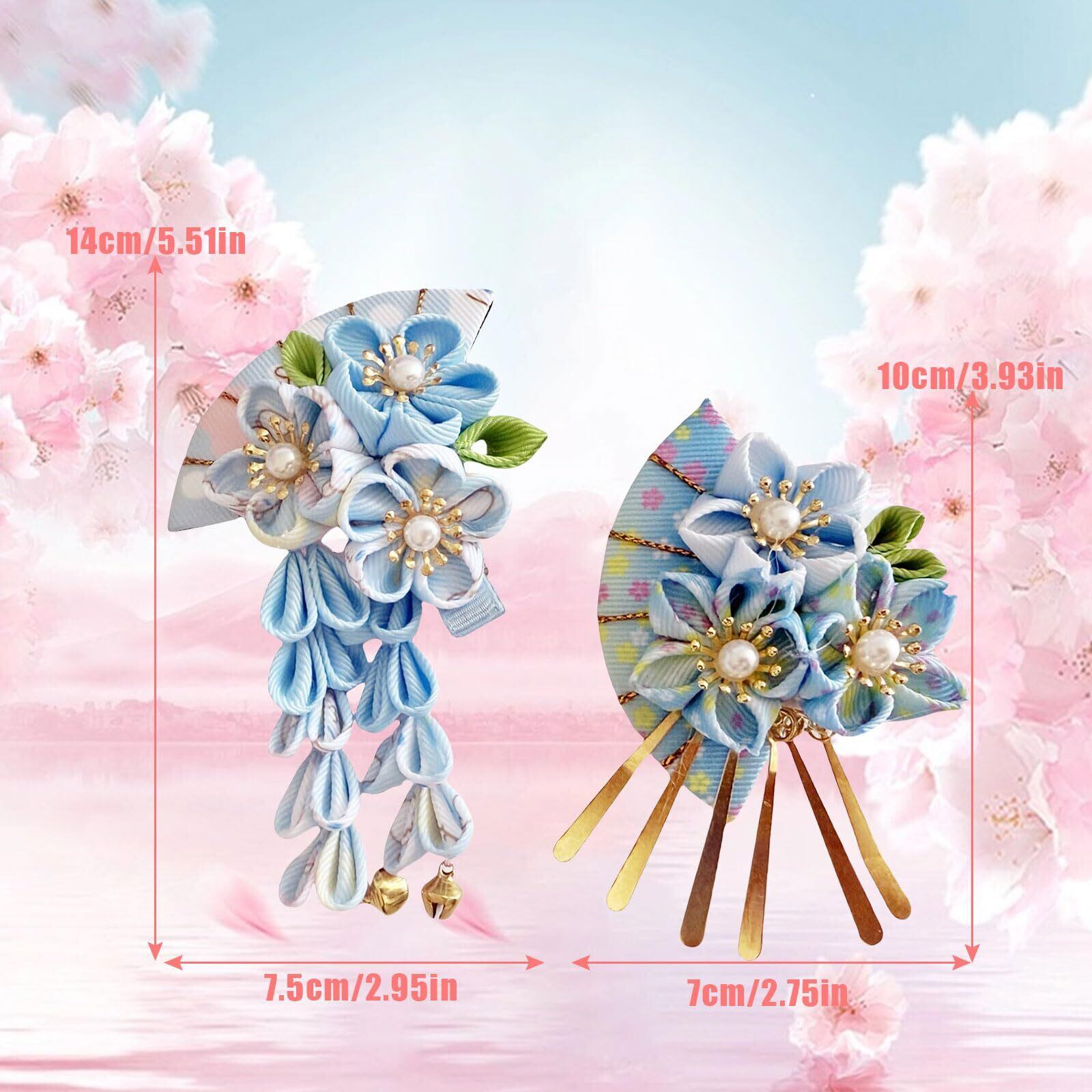 和装 髪飾り 扇型 2点セット ヘアクリップ 花 中華風 漢服 浴衣 和装 ヘアアクセサリー ヘッドドレス 子供髪飾り 入学式 卒業式 七五三 夏祭り 花火大会 (青)