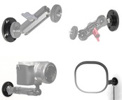 固定プレート中央のネジ穴サイズは3/8インチの切り目、付属のネジ径変換アダプターねじ(コンバーター)を差し込めば1/4インチに対応します。別売のアダプターネジ(1/4-1/4, 1/4-3/8, 3/8-3/8;オス-オス, オス-メス)等を使用することで自由雲台・ボールヘッド、ティルト マジックアーム、チルト角度変更アダプターなどにも対応します。ウォールマウント、シーリングマウントとしての使用、室内・野外・屋外・作業現場、アウトドア、などロケーションを問わず写真や動画撮影での撮影機材の組み込みやスタジオ・音響機器の使用範囲が広がります。