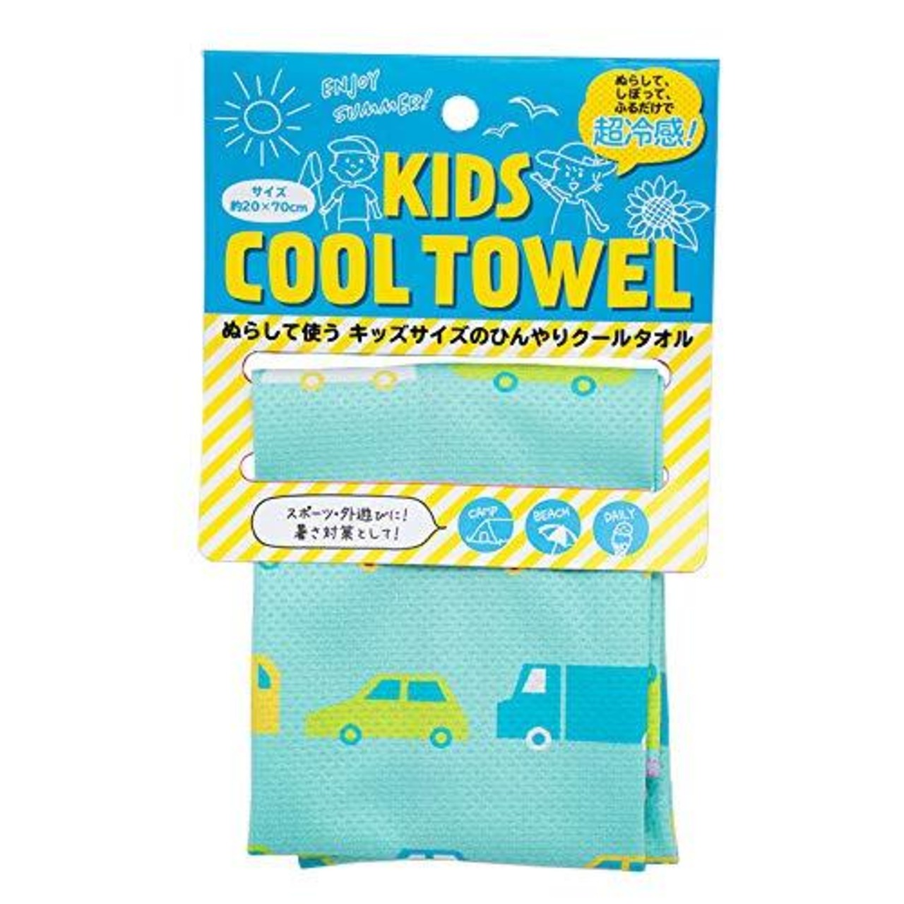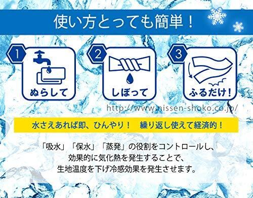 お子様に使いやすいキッズサイズです。 使い方とっても簡単!水さえあれば即、ひんやり!繰り返し使えて経済的! 「吸水」「保水」「蒸発」の役割をコントロールし、効果的に気化熱を発生することで、生地の温度を下げ冷感効果を発生させます。 冷たさがなくなってきたら、振ると 何度も冷たくなります。