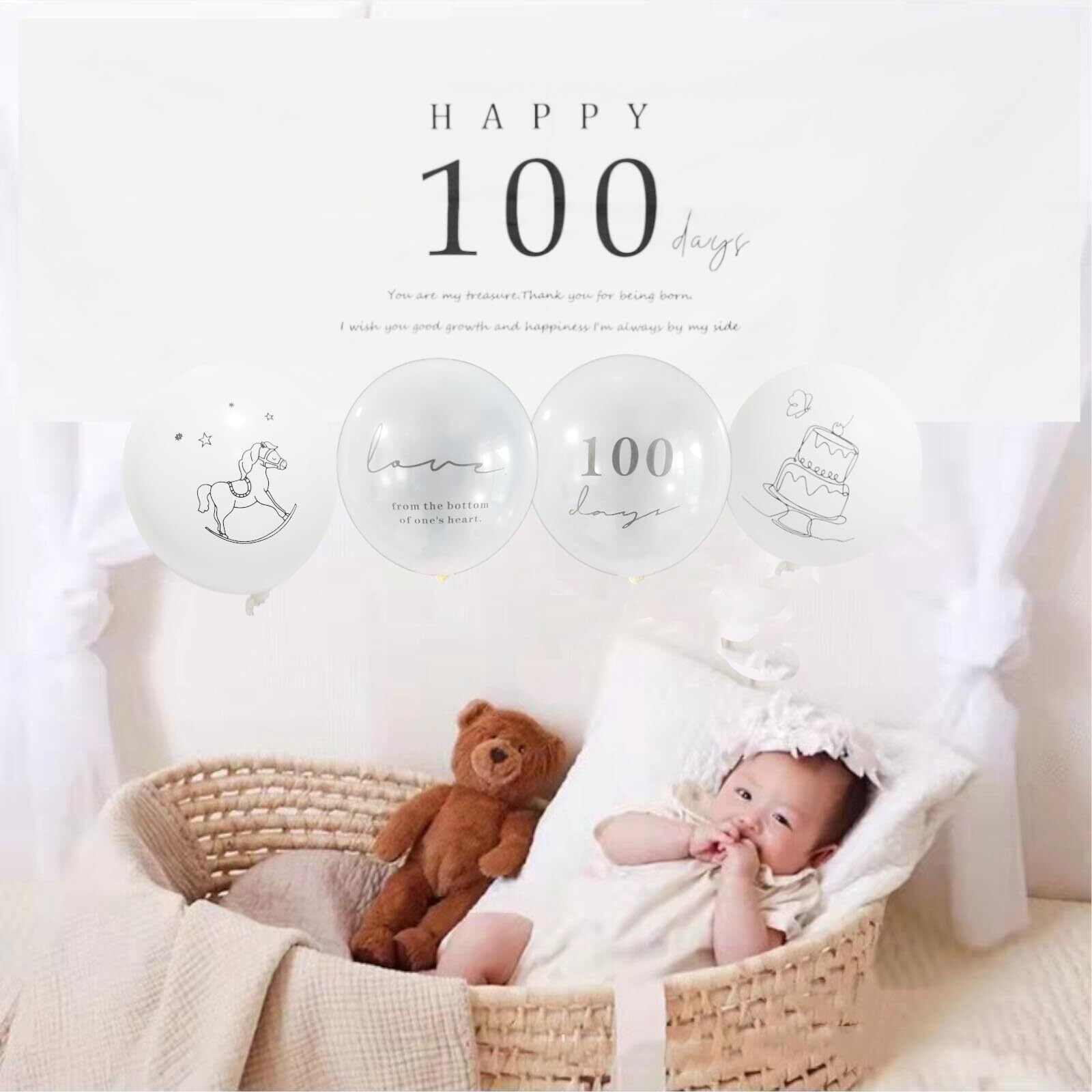 【飾りつけ】高級生地材質タペストリーに、風船で色味をプラスして、100日記念日演出を出来ます。お子様の100日お誕生日に、白のモノトーン色調でお誕生日の飾りとしては最適です。一生に一度の大切な100日目のお誕生日におすすめです。自宅でも100日お誕生日感を演出した写真撮影ができます。