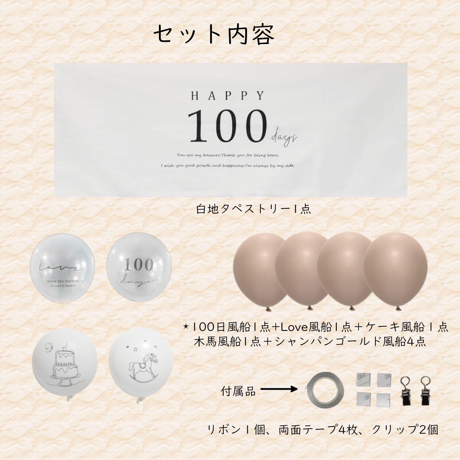 【セット内容物】白地タペストリー1点+100日風船1点+Love風船1点+ケーキ風船1点+木馬風船1点+色風船4点。※付属品に押しピンありますので開封時針にご注意お願い致します。