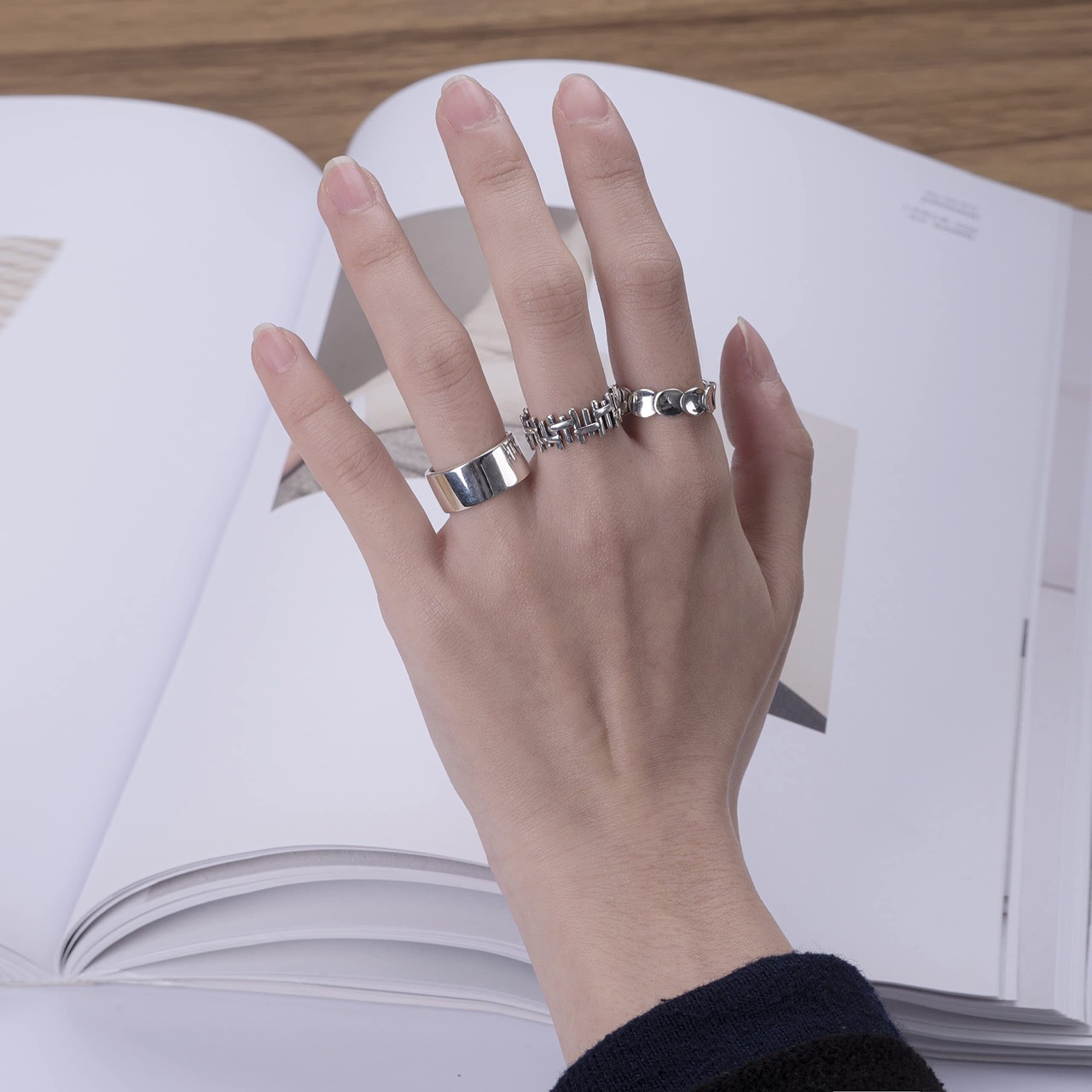 【オリジナル ジュエリー】それぞれが特徴的なシルエットになっており、2連,3連付けでも単体で使ってもコーディネートにアクセントをもたらしてくれます。すっと肌に溶け込むようなシルバーのリングでさりげないようでいて、2連,3連を重ねると手元の印象がインパクトを演出。