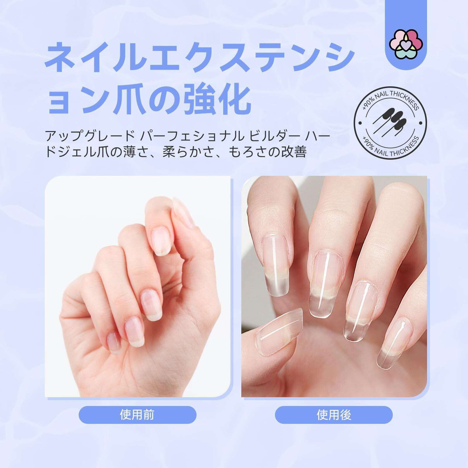 滑らかな質感 クリアビルダーネイルジェルラバーベースジェルは、優れたセルフレベリングを備えており、すばやく塗布して形を整えることができます。ビルダーネイルジェルを使用すると、強く、長く、耐久性があり、自然なネイルを簡単に作ることができます。