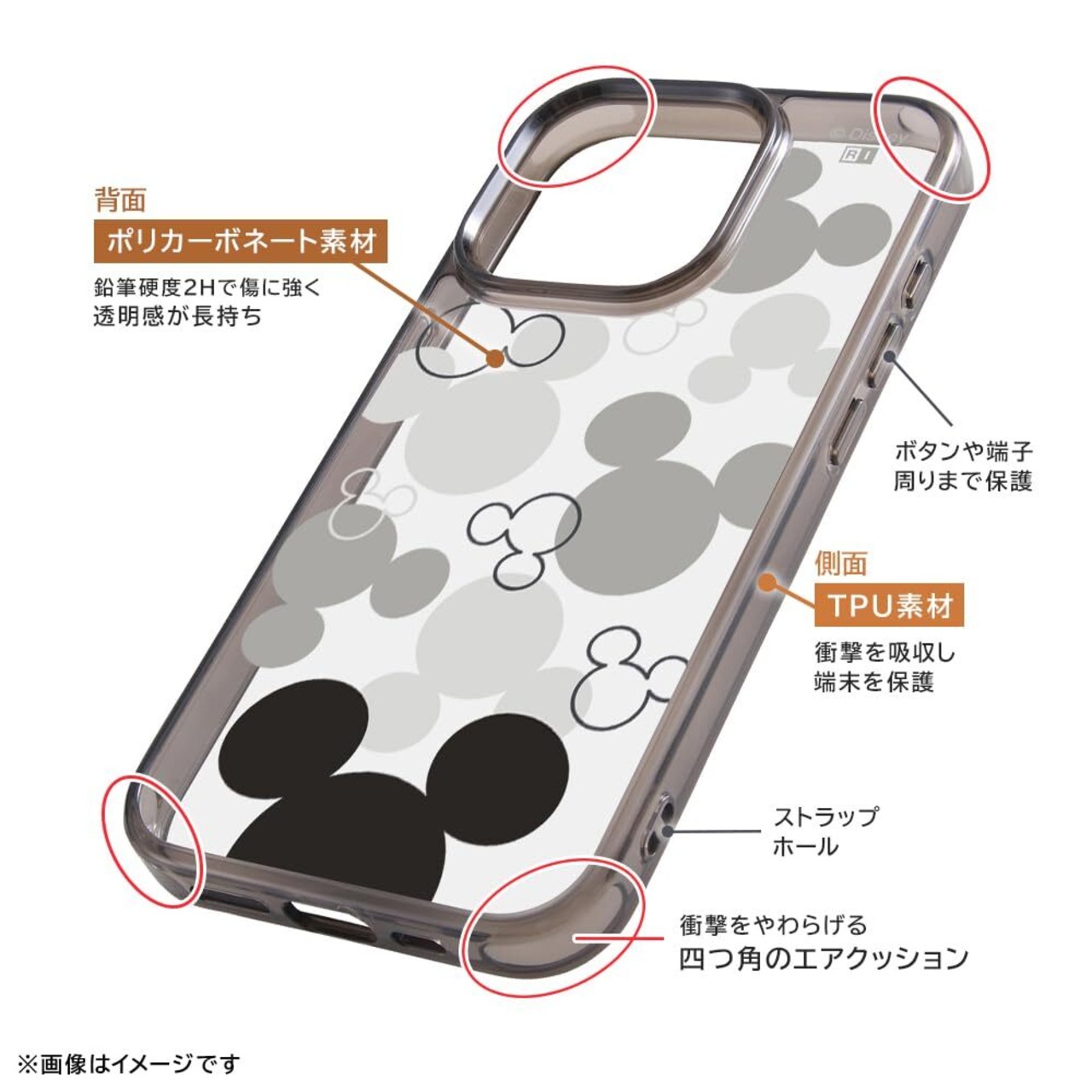 (C) Disney カメラレンズに傷が付きにくい。鉛筆硬度2Hで傷に強い。衝撃をやわらげる四つ角のエアクッション構造 。ボタンや端子周りまで保護。 『 ミッキー&フレンズ 』 ミッキー ( ミッキーマウス )